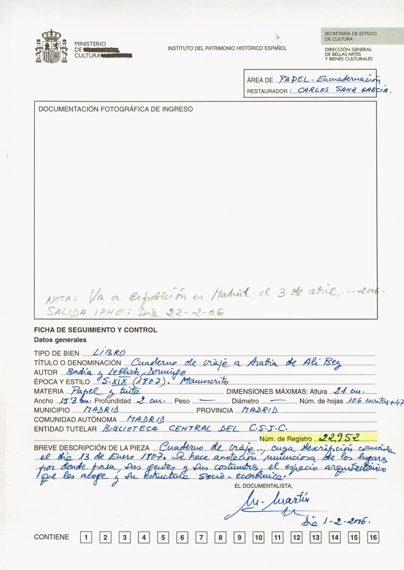 Restauración del libro "Cuaderno de viaje a Arabia de Alí Bey", de Domingo Badía y Leblich de la Biblioteca Central. Consejo Superior de Investigaciones Científicas (Madrid)