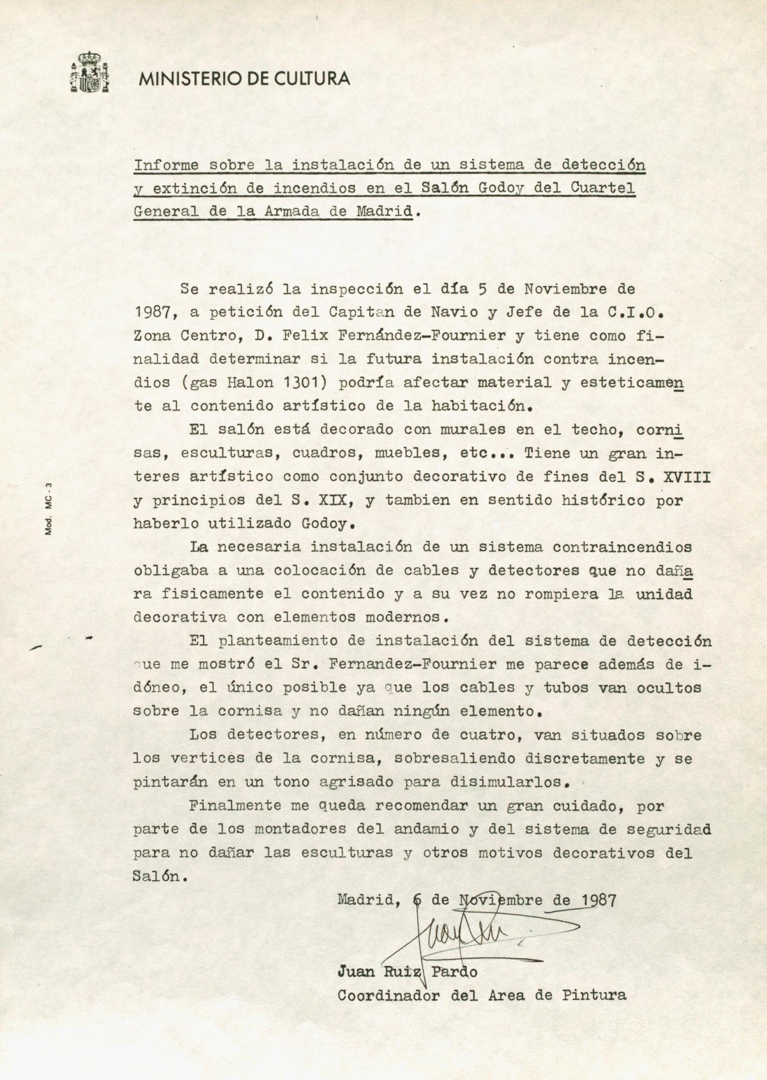 Informe sobre la instalación de un sistema de detección y extinción de incendios en el Salón Godoy del Cuartel General de la Armada de Madrid