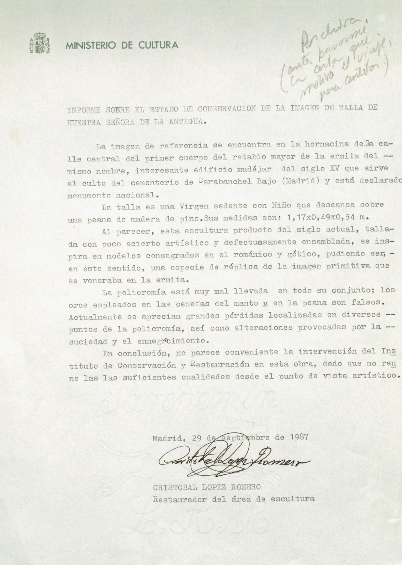 Informe de conservación de una talla en madera de Nuestra Señora de la Antigua", de la Ermita de Santa María la Antigua en Carabanchel (Madrid), procedente de la Congregación de Nuestra Señora del Carmelo y Cristo Yacente