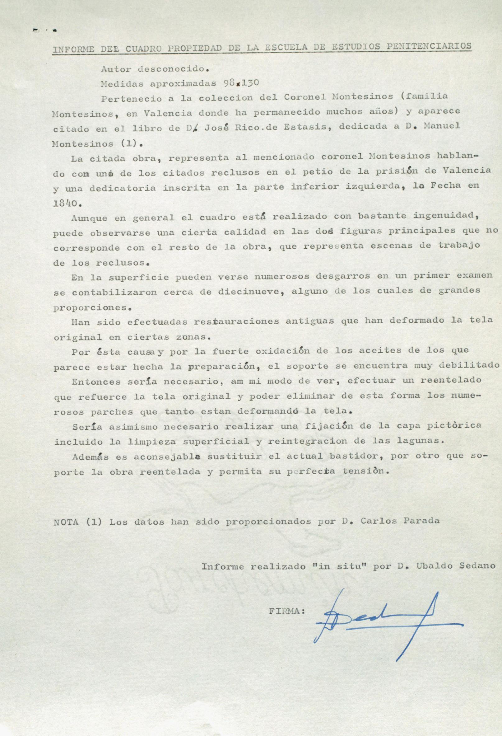 Informe de visita para la restauración de un cuadro del "Coronel Montesinos" procedente de la Escuela de Estudios Penitenciarios del Ministerio de Justicia (Madrid)