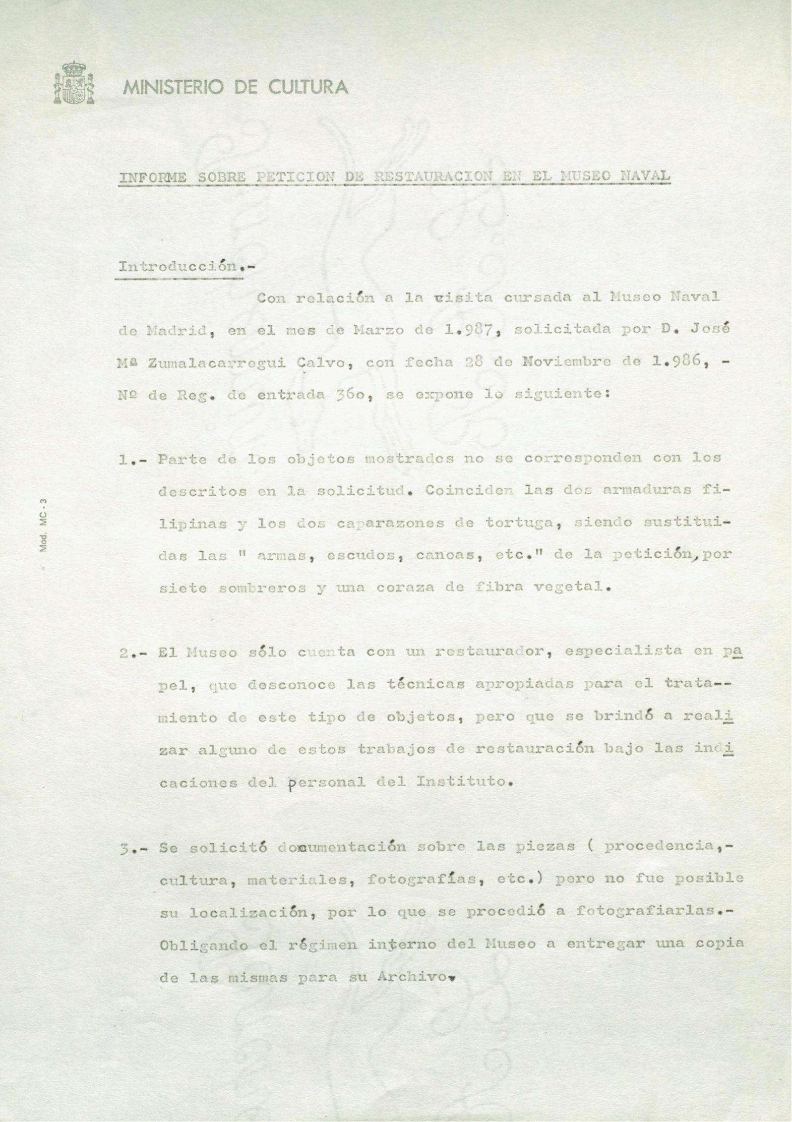 Informe de visita para la restauración de varias piezas de madera, dos armaduras filipinas en carey y dos caparazones de tortuga procedentes del Museo Naval (Madrid)