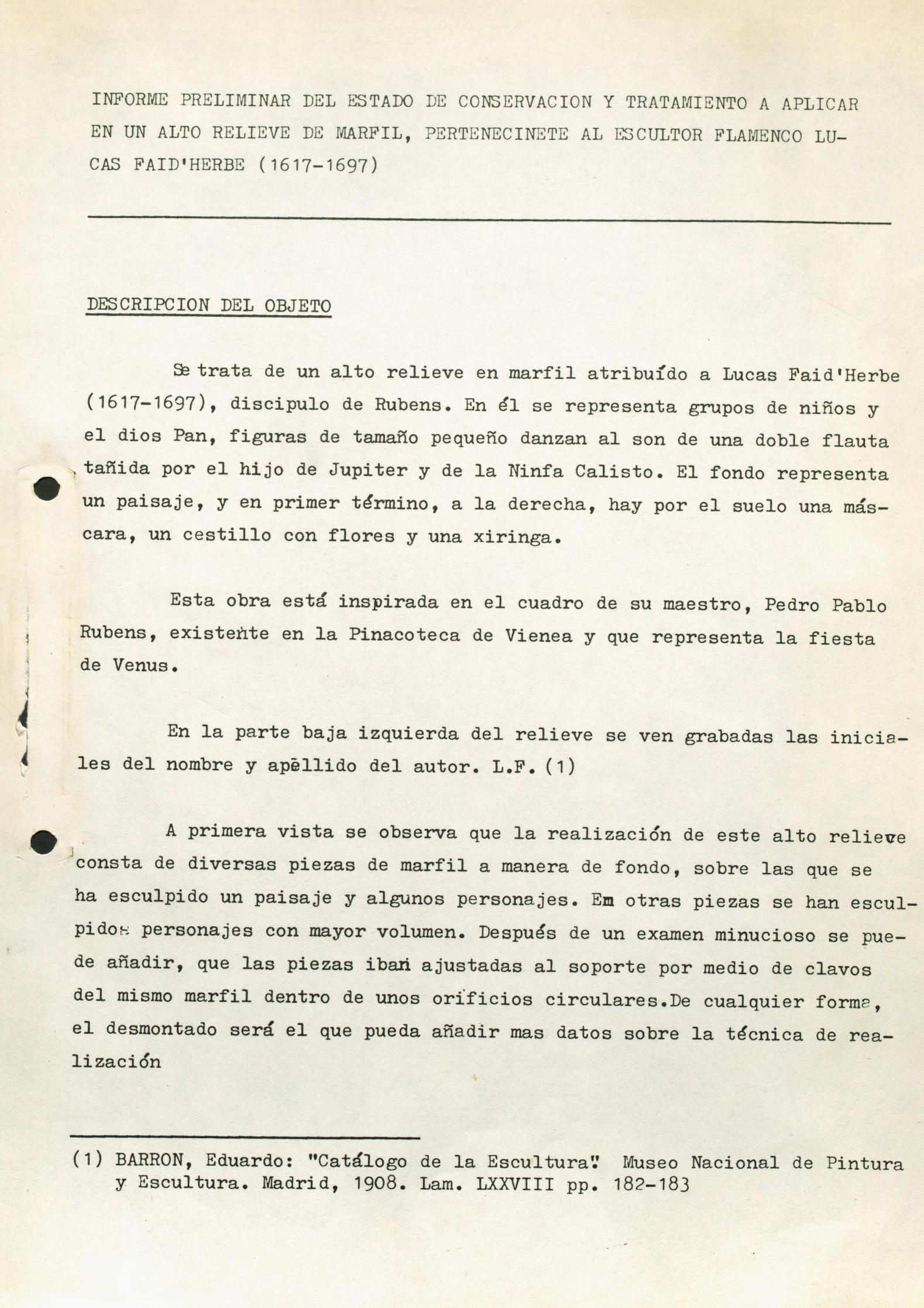 Informe de conservación de un alto relieve de marfil de Lucas Faid'herbe del Museo Nacional del Prado (Madrid)