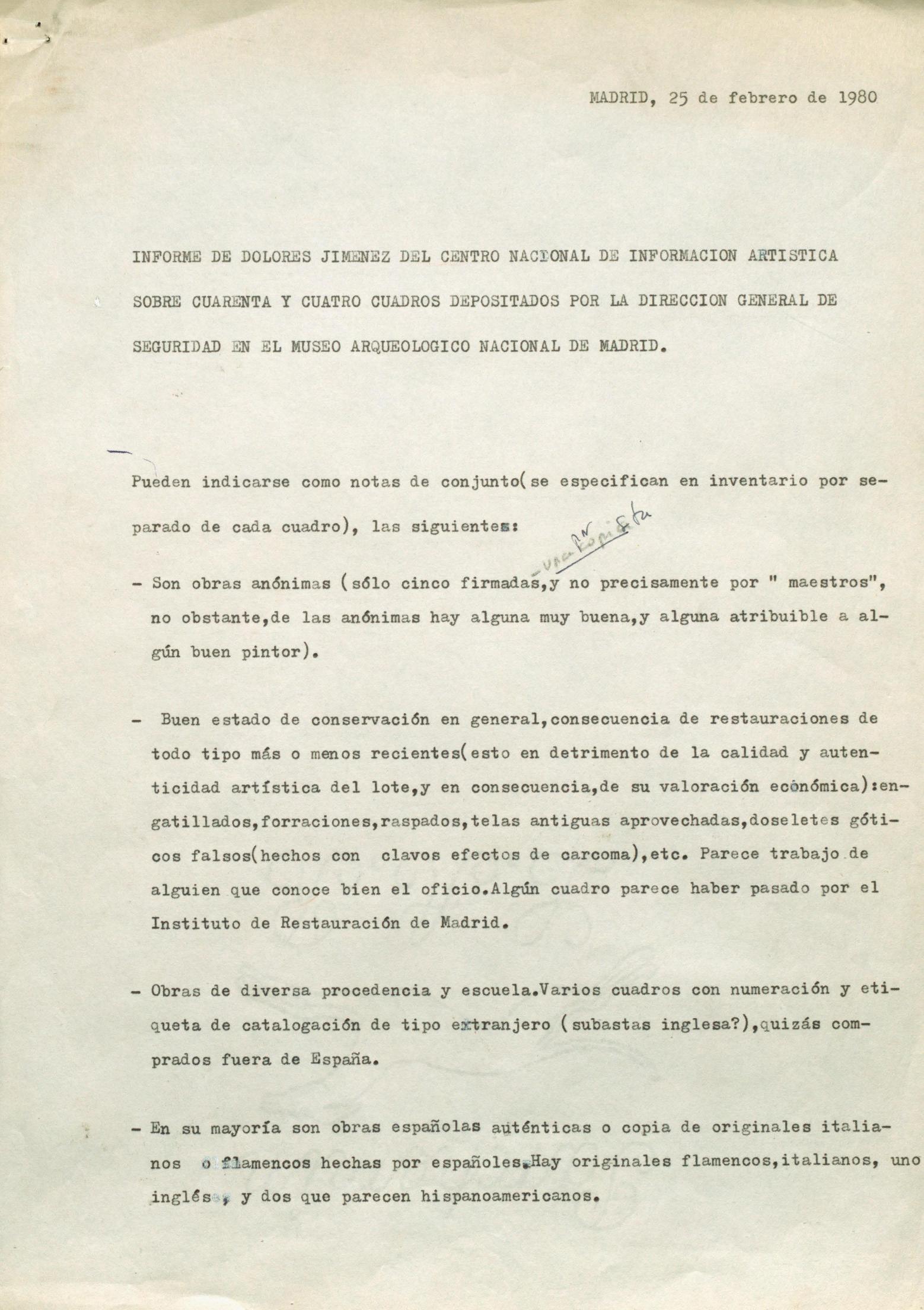 Informe histórico-artístico del Centro Nacional de Información Artística sobre cuarenta y cuatro cuadros depositados por la Dirección General de Seguridad en el Museo Arqueológico Nacional (Madrid)