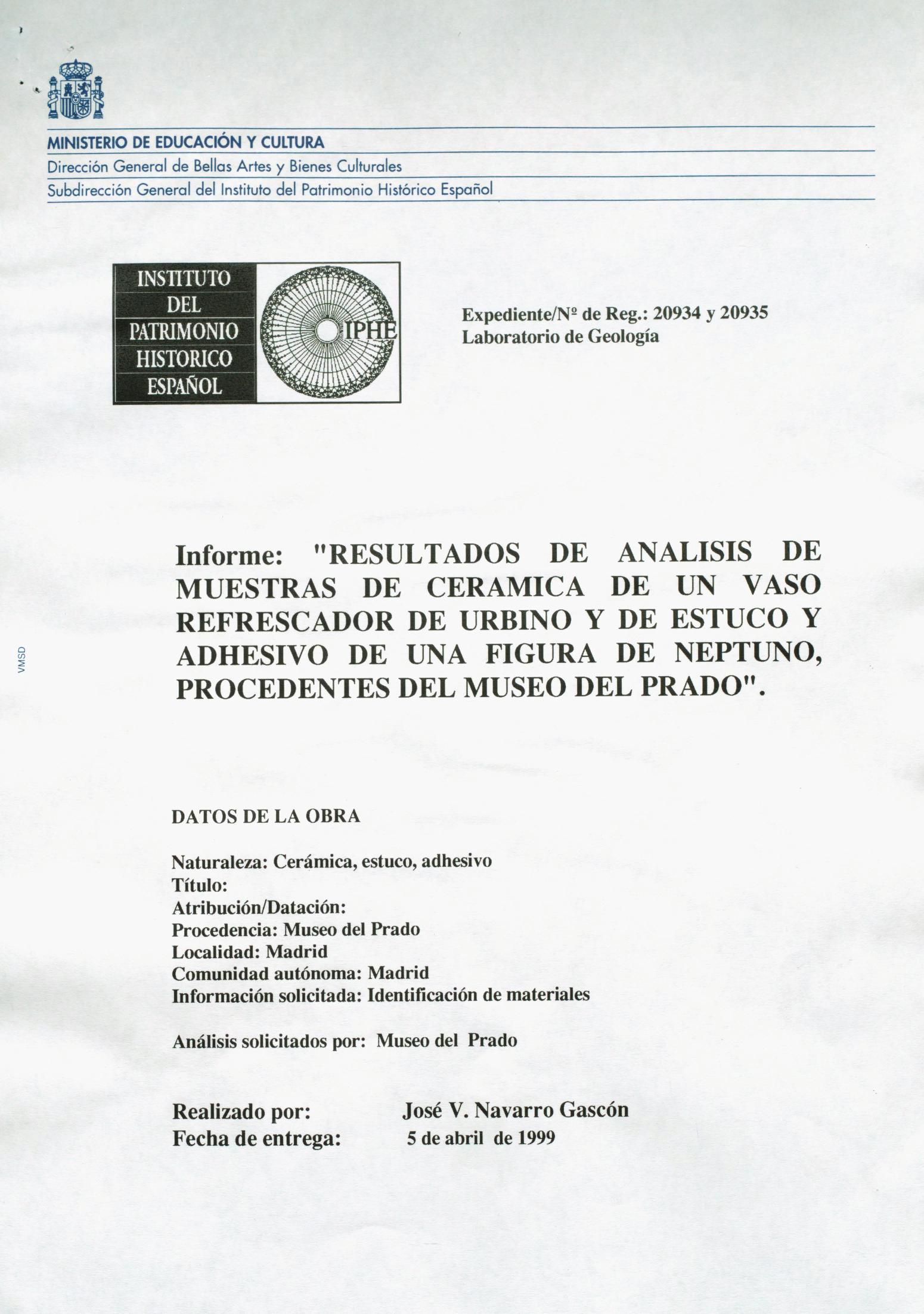 Informe sobre el análisis de muestras de cerámica de un vaso refrescador de Urbino y de estuco, así como el adhesivo de una escultura de Neptuno de la fábrica del Buen Retiro, procedentes del Museo Nacional del Prado (Madrid)