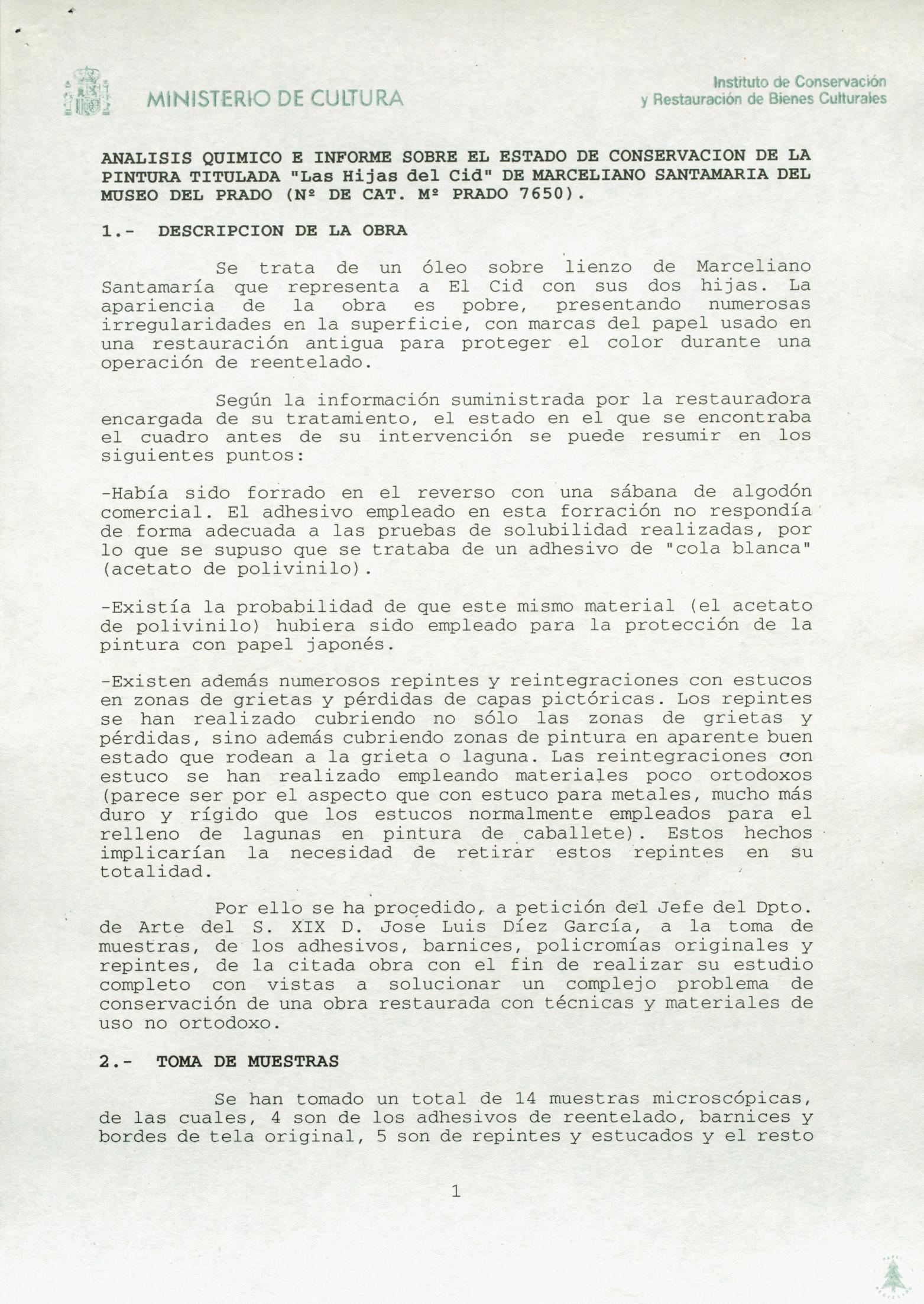 Informe sobre el estado de conservación y análisis químico de la pintura "Las hijas del Cid", de Marceliano Santamaría, procedente del Museo Nacional del Prado (Madrid)