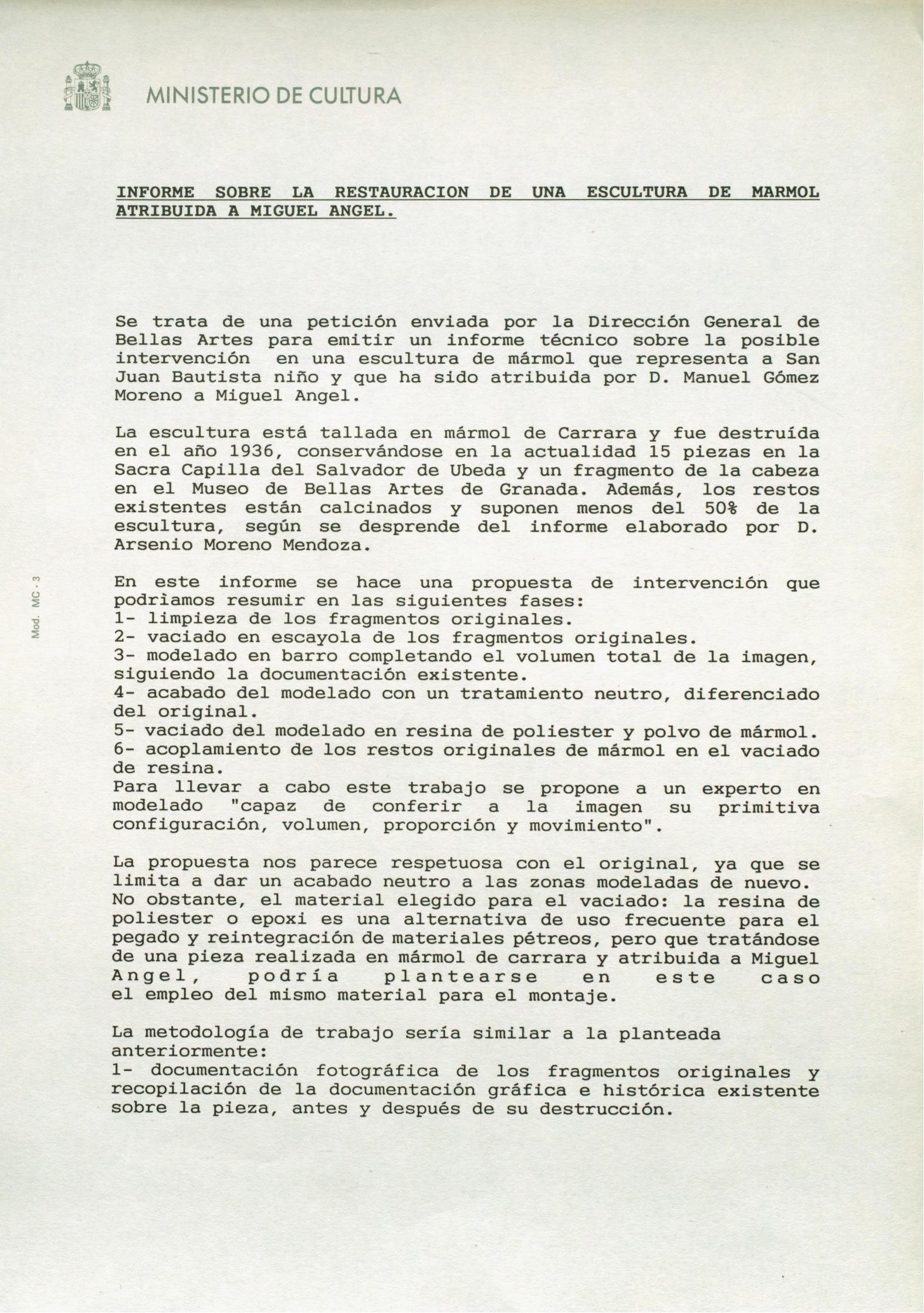 Informes de conservación de la escultura de "San Juan Bautista Niño" o "San Juanito", atribuida a Miguel Ángel, depositada en la Iglesia del Salvador de Úbeda (Jaén)