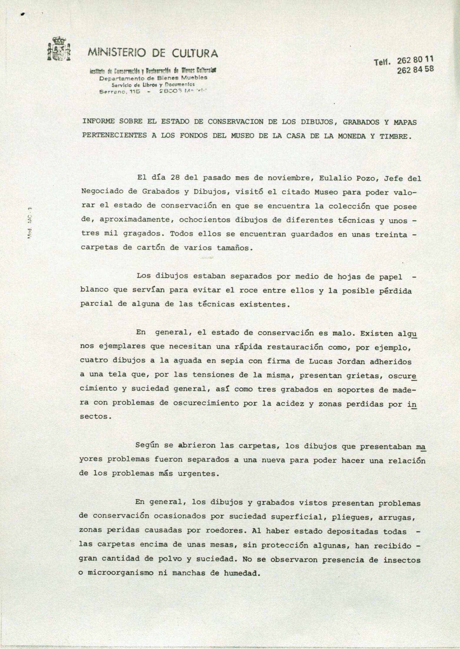 Informe visita para la conservación de la colección de dibujos, grabados, mapas y libros, del siglo XVI al XIX, procedentes de la Fábrica Nacional de Moneda y Timbre de Madrid