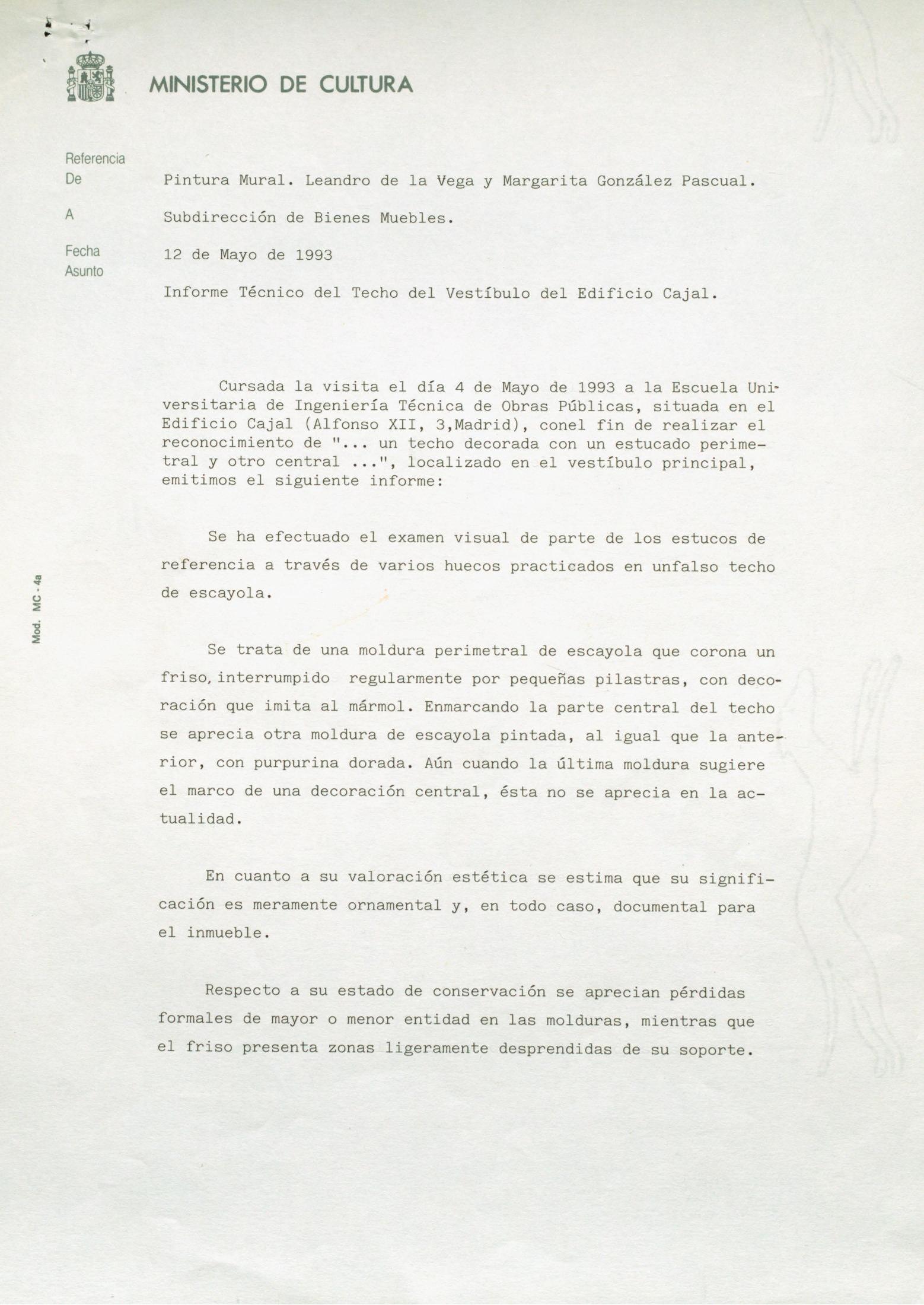 Informe de visita del techo del vestíbulo perteneciente al Edificio Cajal, en la Escuela Universitaria de Ingeniería Técnica de Obras Públicas de la Universidad Politécnica de Madrid