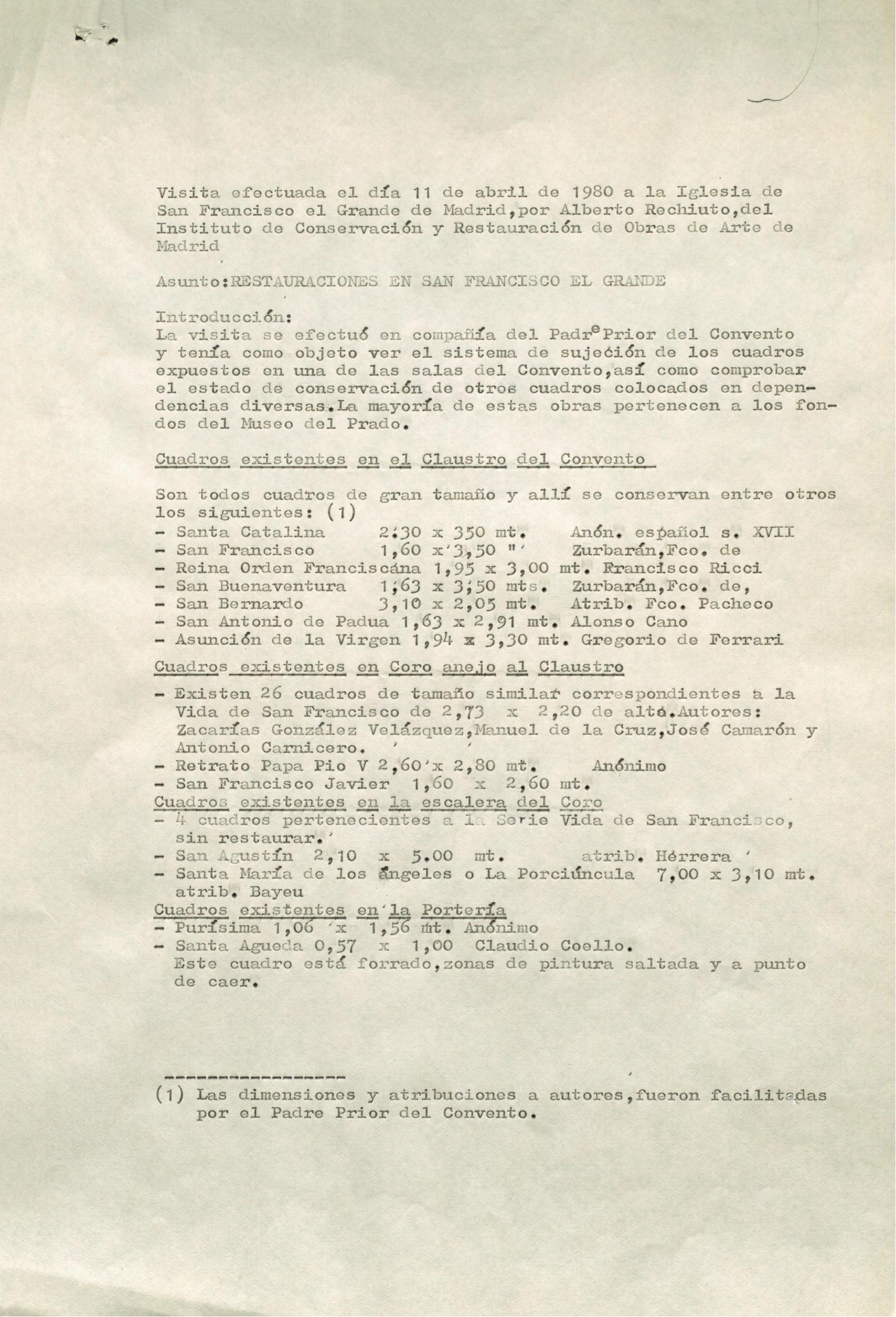Informe de visita para la valoración del sistema de sujeción de cuadros del claustro del convento, coro anejo, escaleras y portería de la Real Basílica de San Francisco el Grande (Madrid), pertenecientes al Museo Nacional del Prado (Madrid)