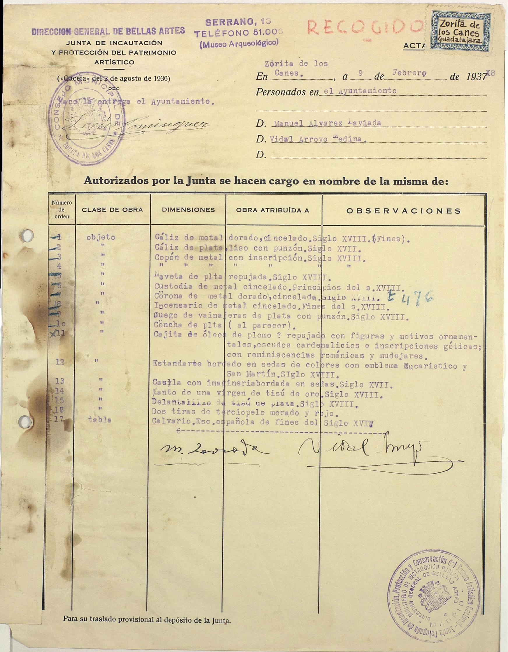 Acta de incautación de Zorita de los Canes (Guadalajara)