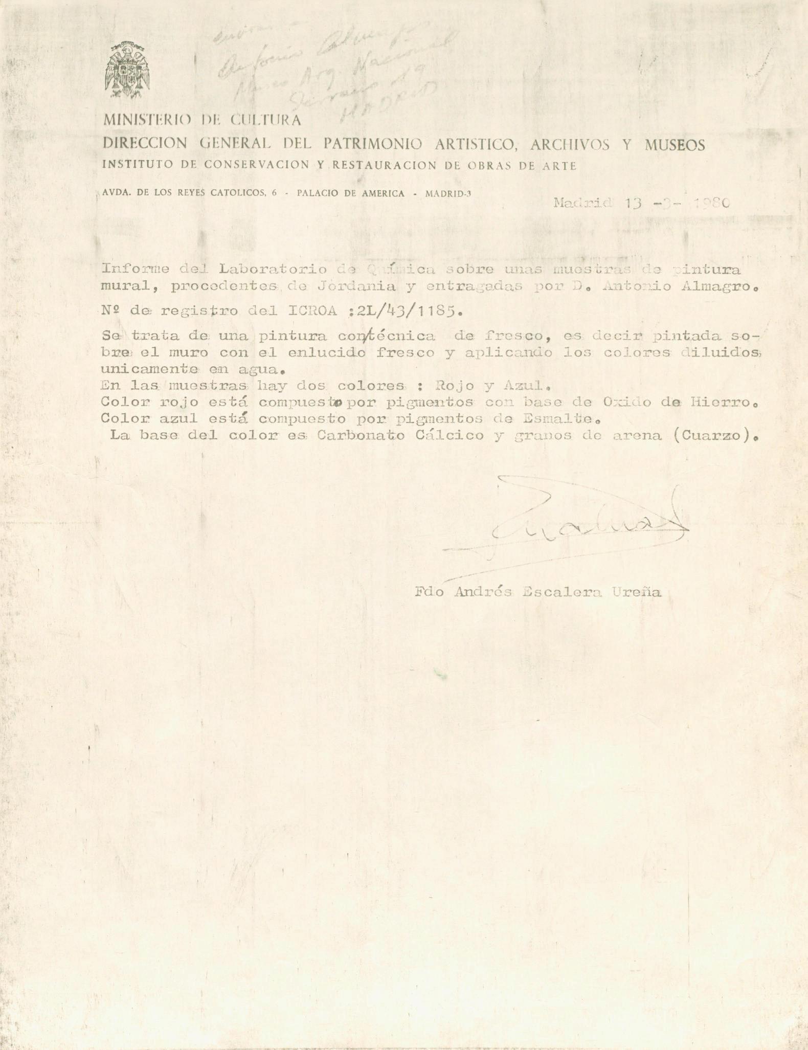 Informe de laboratorio de una muestra de pintura mural, procedente de Jordania, del Museo Arqueológico Nacional de Madrid