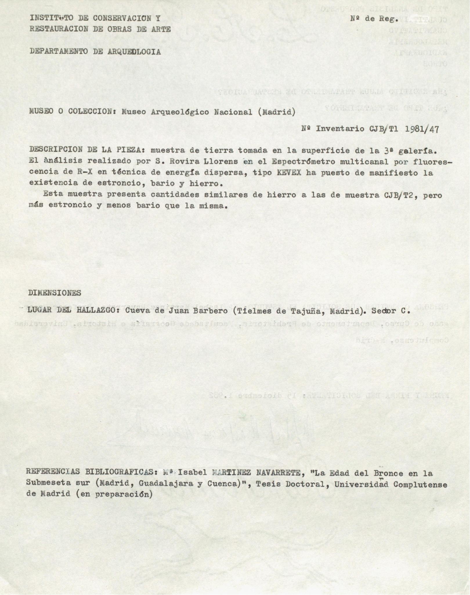 Informe de laboratorio sobre una muestra de tierra, de un punzón y de un hueso de equino, procedentes de la Cueva de Juan Barbero en Tielmes de Tajuña (Madrid). Museo Arqueológico Nacional de Madrid