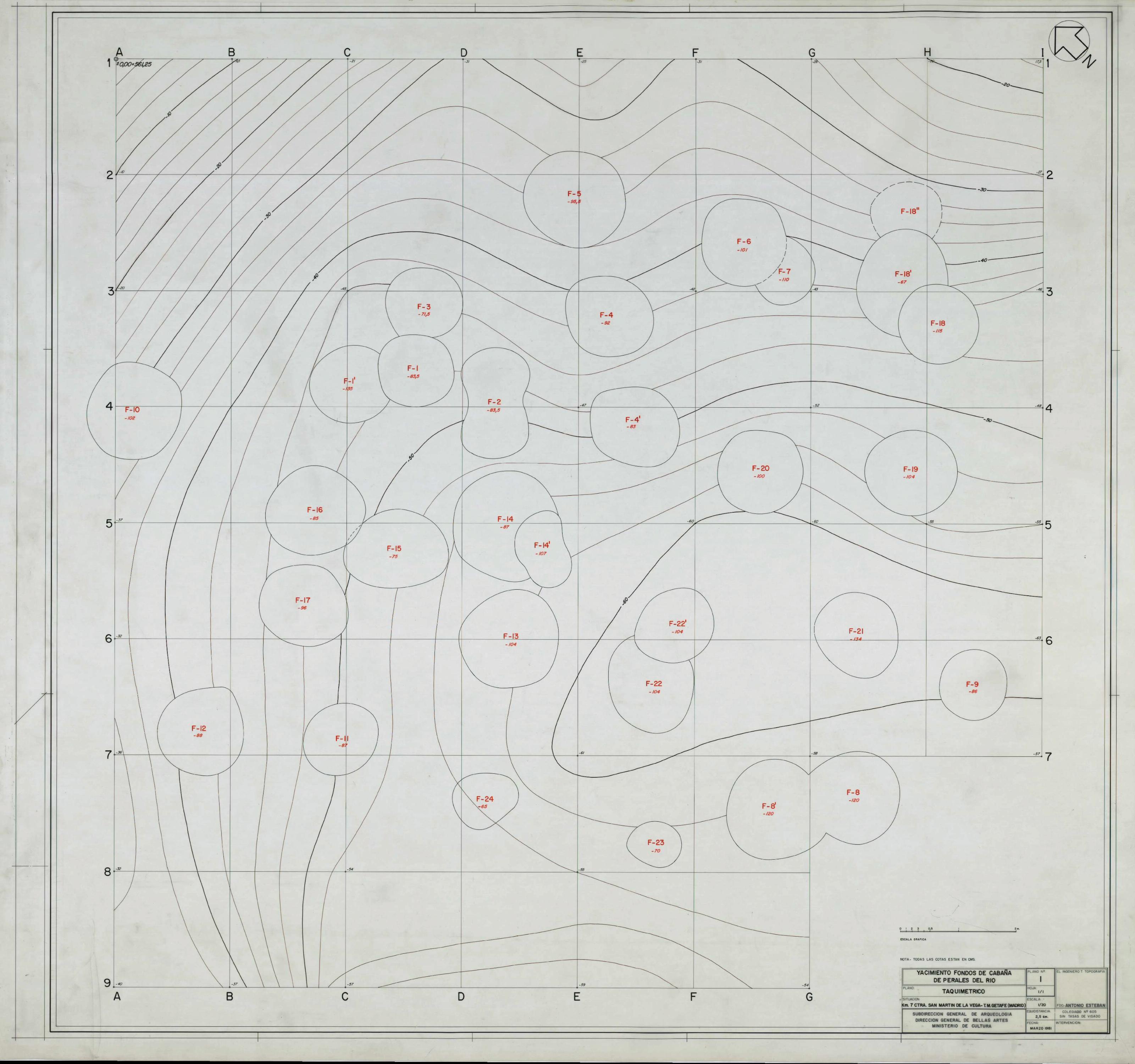 YACIMIENTO ARQUEOLOGICO FONDOS DE CABAÑA DE PERALES DEL RIO. (HMTN 582): Plano TAQUIMETRICO DE LA ZONA DE CUADRICULAS del yacimiento arqueológico.