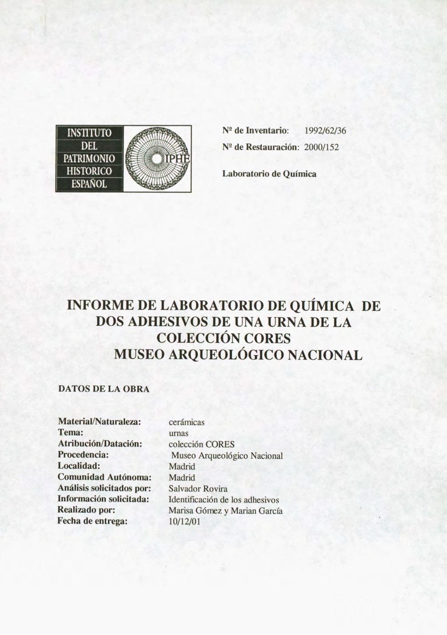 Informe de laboratorio sobre el análisis químico de dos adhesivos de la urna de la "Colección Cores", procedente del Museo Arqueológico Nacional (Madrid)