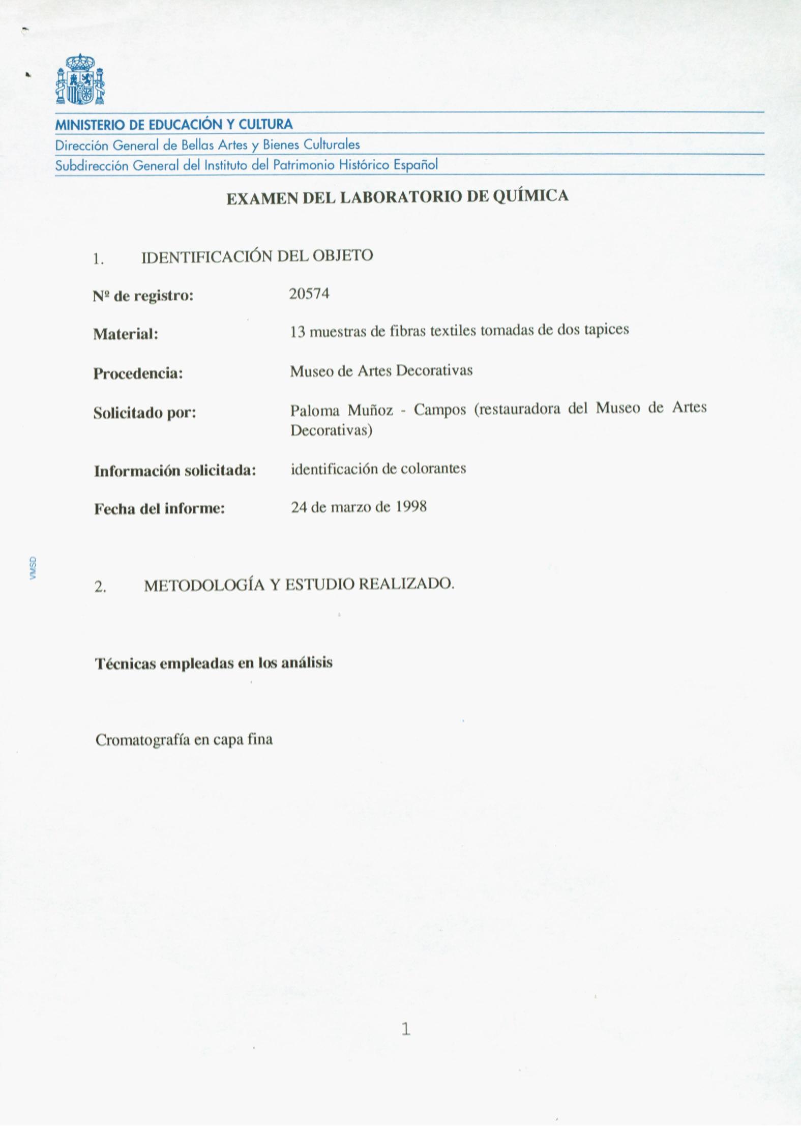 Informes sobre análisis de laboratorio de trece muestras de tejidos tomadas de dos tapices, e identificación de siete muestras de insectos procedentes del Museo Nacional de Artes Decorativas (Madrid)