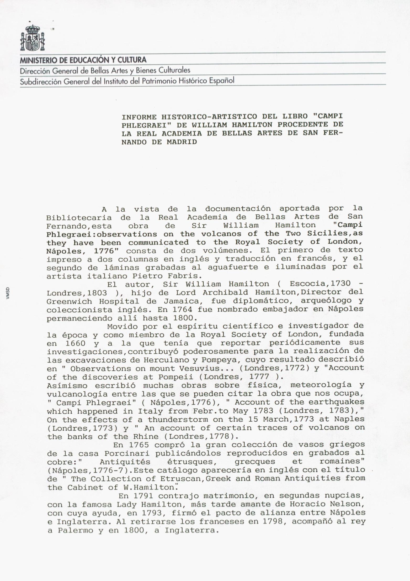 Informe de conservación del libro "Campi Phlegraei", de William Hamilton, procedente de la Biblioteca Archivo de la Real Academia de Bellas Artes de San Fernando (Madrid)
