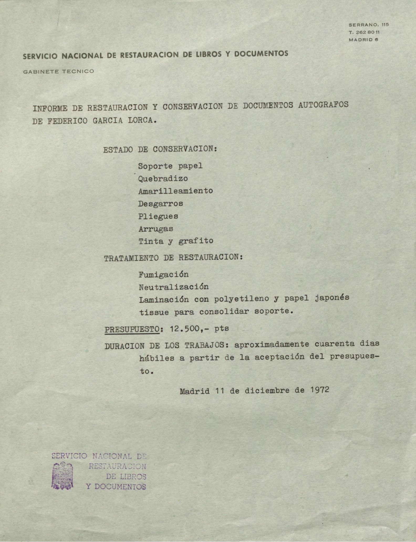 Informe de conservación y propuesta de restauración de documentos autógrafos de Federico García Lorca
