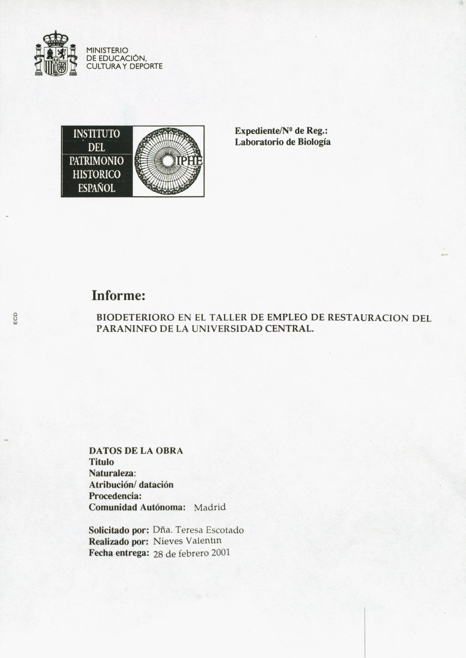 Informe sobre biodeterioro del entarimado, moqueta y textiles de las paredes del Paraninfo Universitario de la calle San Bernardo, perteneciente a la Universidad Complutense (Madrid)