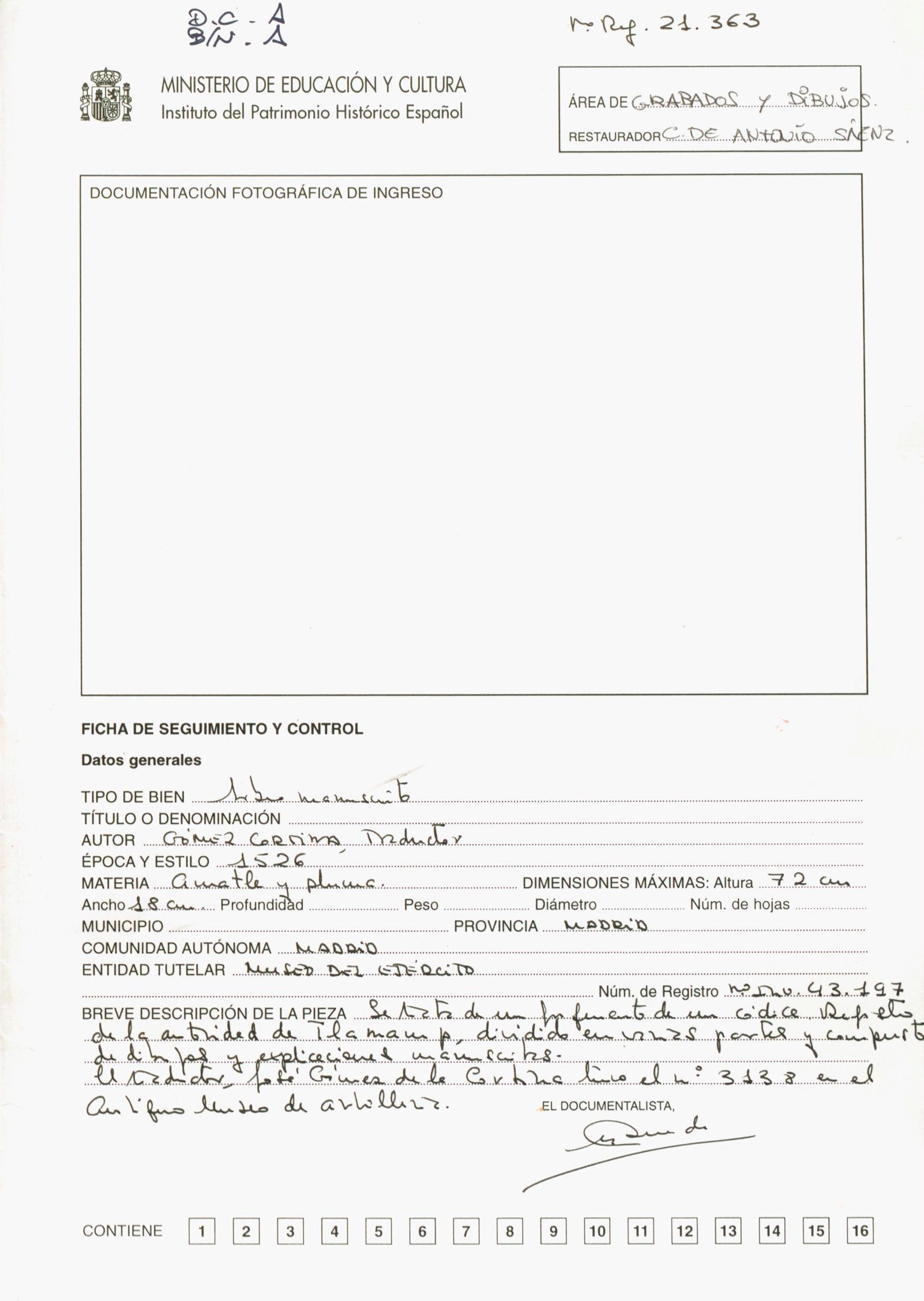 Restauración de un manuscrito en amatle con dibujo a pluma procedente del Museo del Ejército (Madrid)