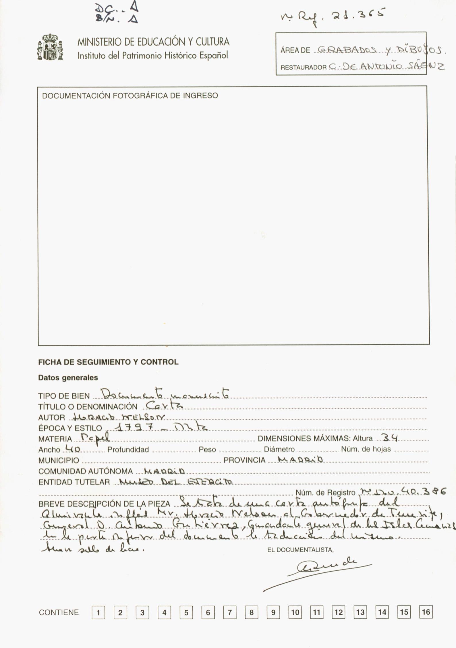 Restauración de una carta manuscrita de Horacio Nelson de 1797, procedente del Museo del Ejército (Madrid)