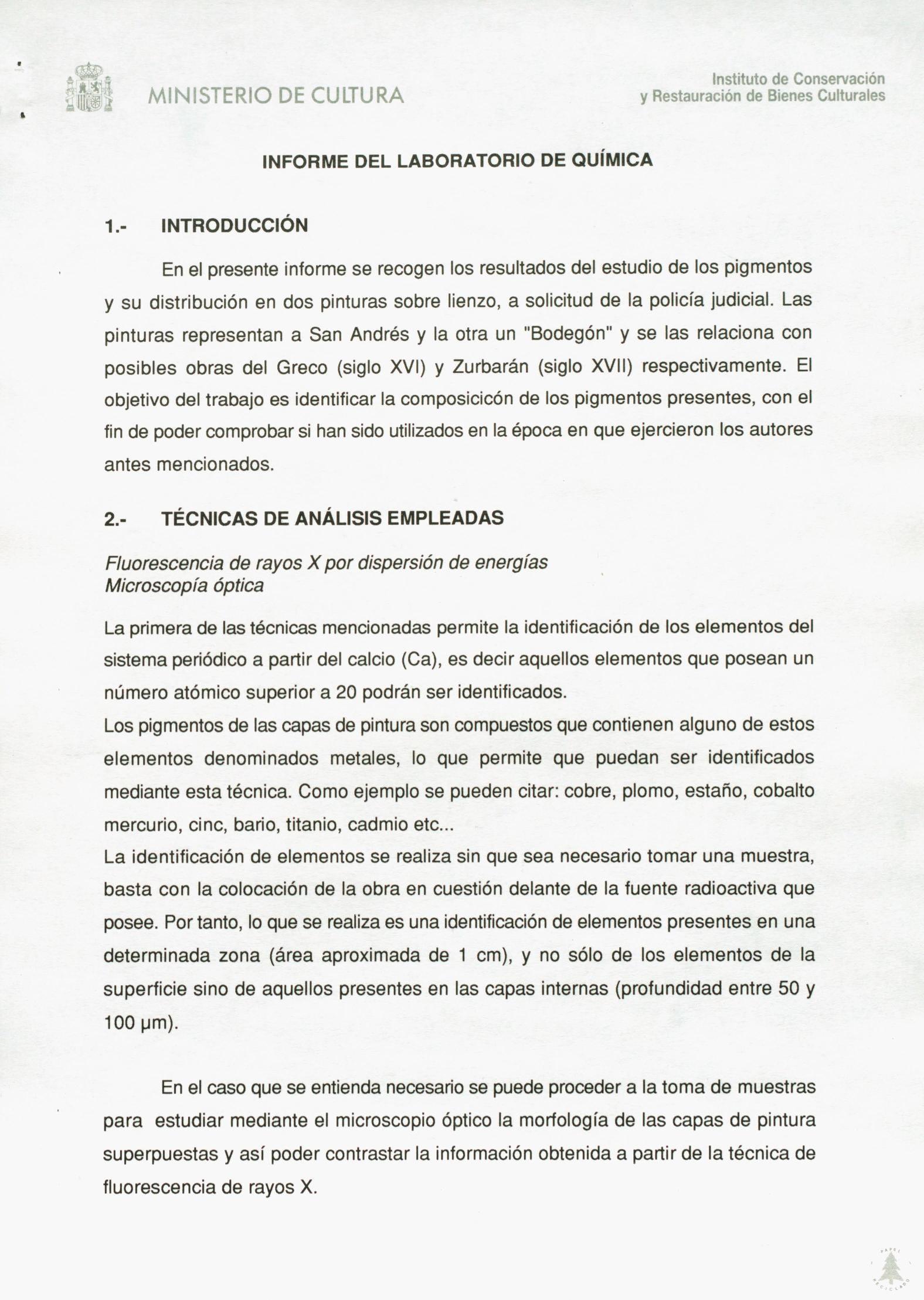 Informes de laboratorio de química y de radiografía de los lienzos "San Andrés" y "Bodegón", atribuidos a El Greco y Francisco de Zurbarán, procedentes de la Policía judicial (Madrid)