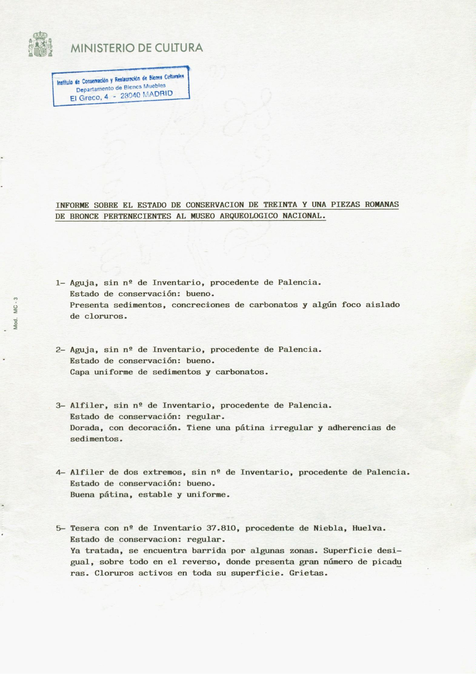Informe de conservación de treinta y una piezas romanas de bronce, pertenecientes al Museo Arqueológico Nacional (Madrid)