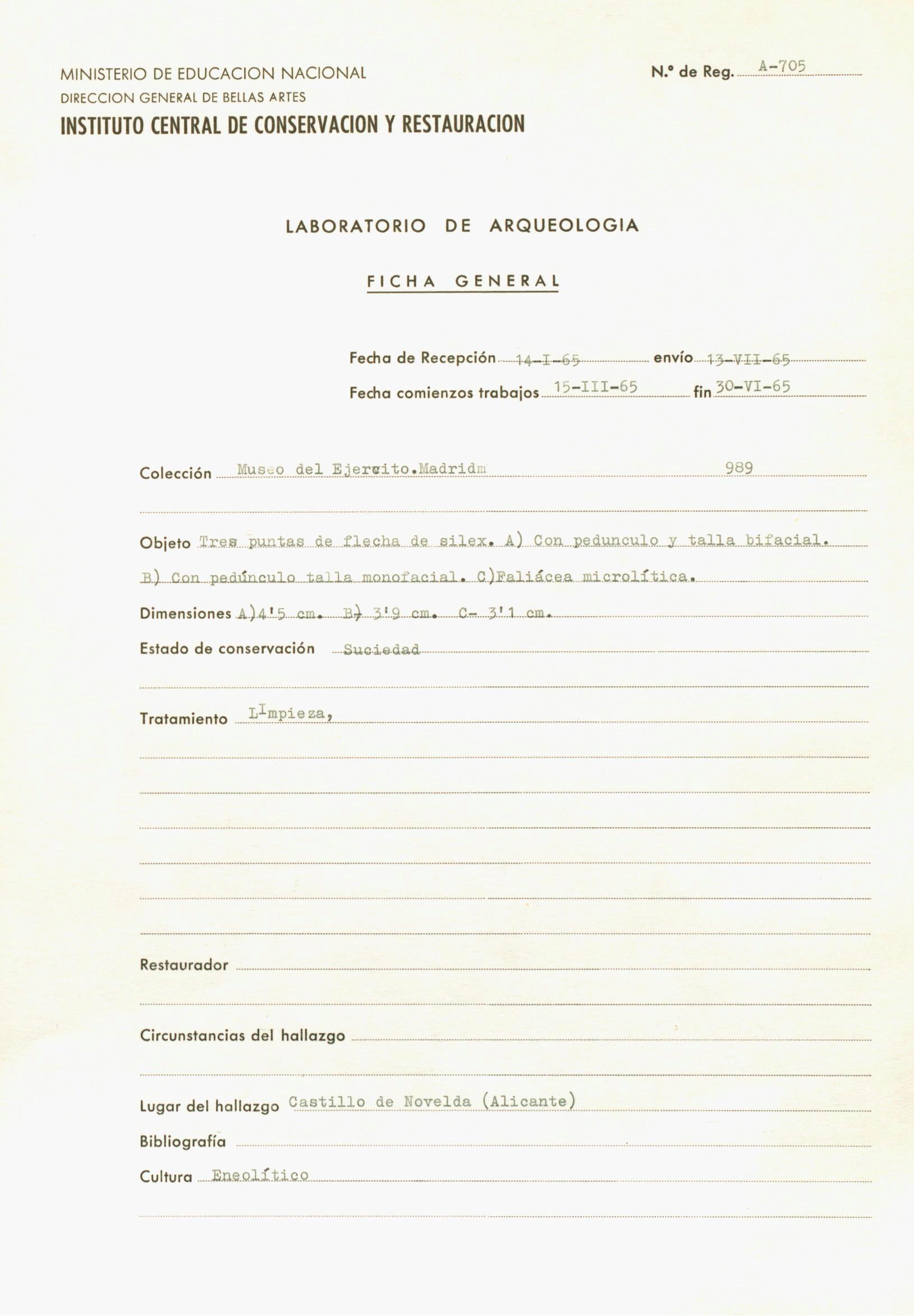Restauración de puntas de flecha de sílex del yacimiento del Castillo de Novelda, procedente del Museo del Ejército (Madrid)