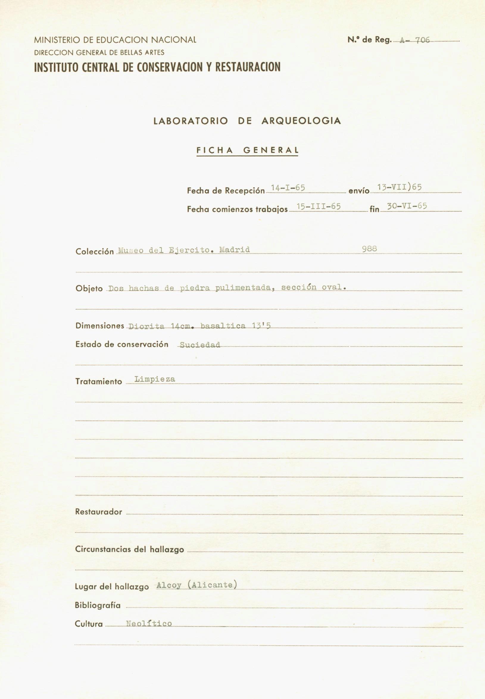 Restauración de dos hachas de piedra pulimentada del yacimiento de Alcoy (Alicante), procedentes del Museo del Ejército (Madrid)