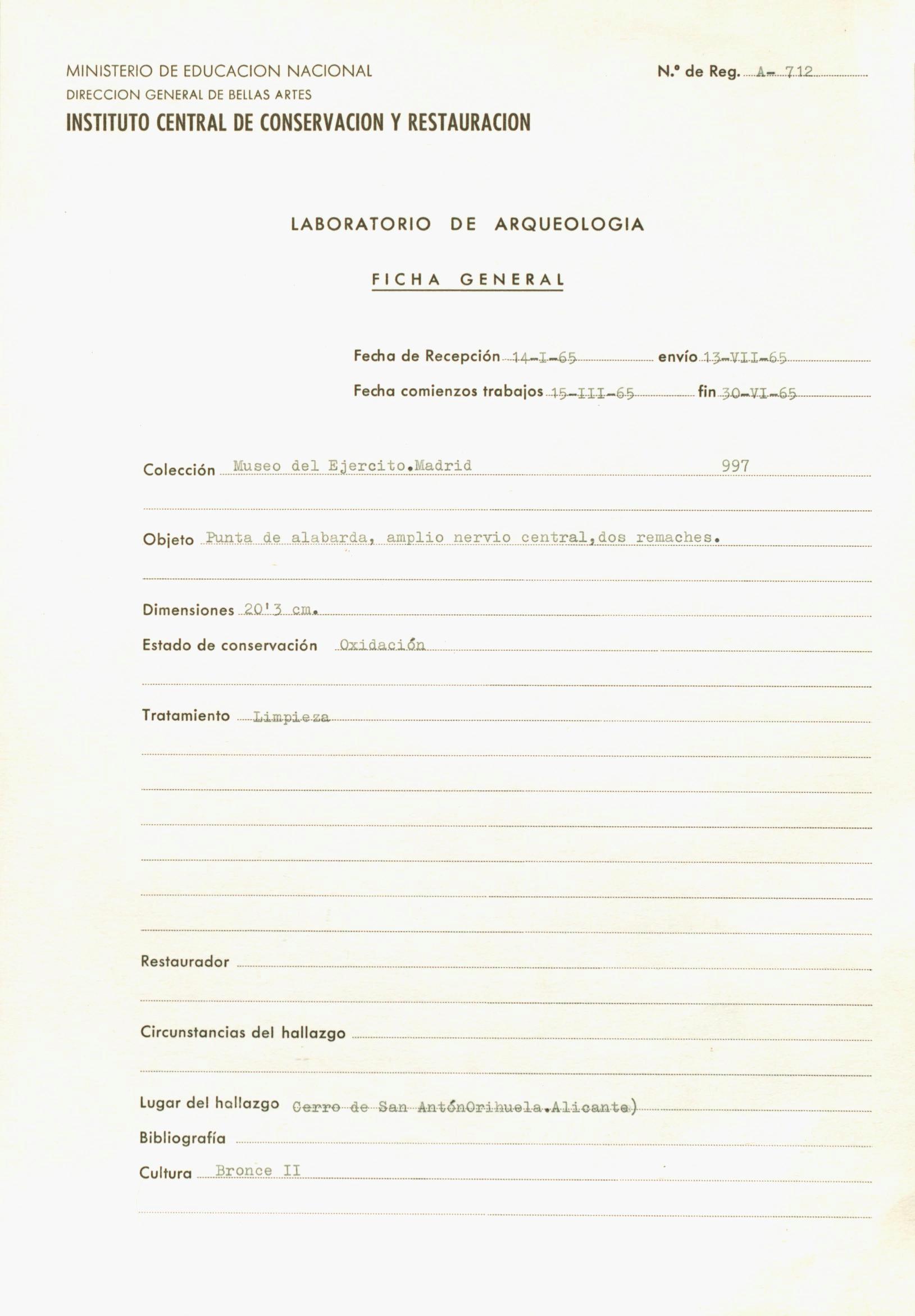 Restauración de una punta de alabarda del yacimiento del Cerro de San Antón (Orihuela, Alicante), procedente del Museo del Ejército (Madrid)