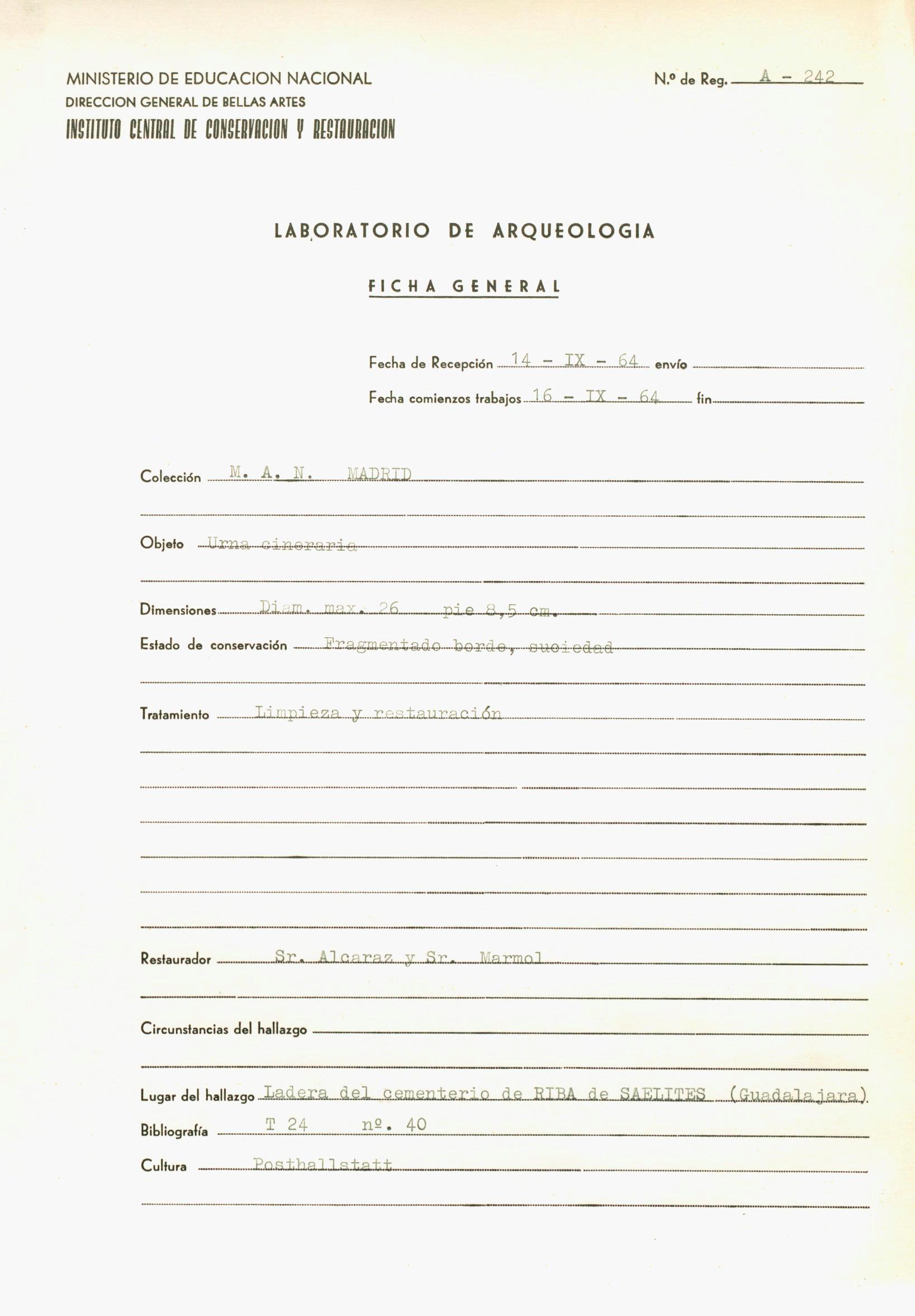 Restauración de urnas cinerarias, fragmentos de cerámica y un bronce de la cultura Posthallstatt del yacimiento de Ribas de Saelices (Guadalajara), procedentes del Museo Arqueológico Nacional (Madrid)