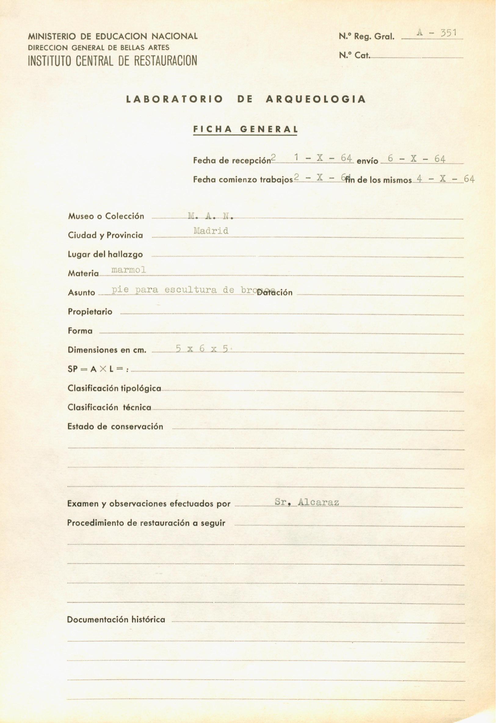 Informes de conservación del pie de mármol para una escultura de bronce, procedente del Museo Arqueológico Nacional (Madrid)