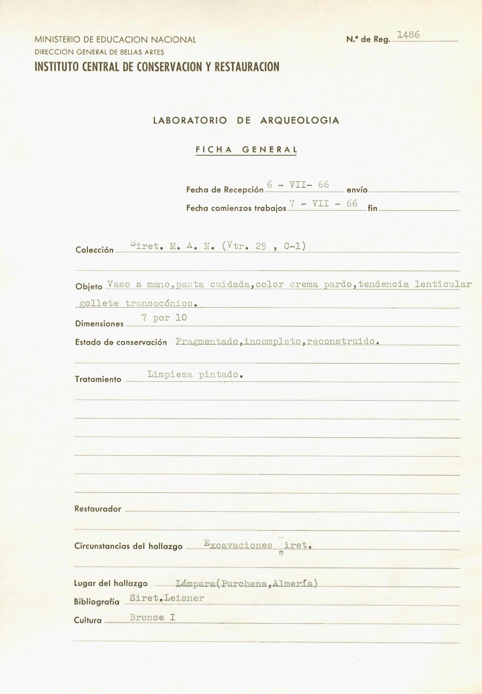 Restauración de piezas arqueológicas del Bronce I del yacimiento del Llano de la Lámpara de Purchena (Almería), procedentes del Museo Arqueológico Nacional (Madrid)