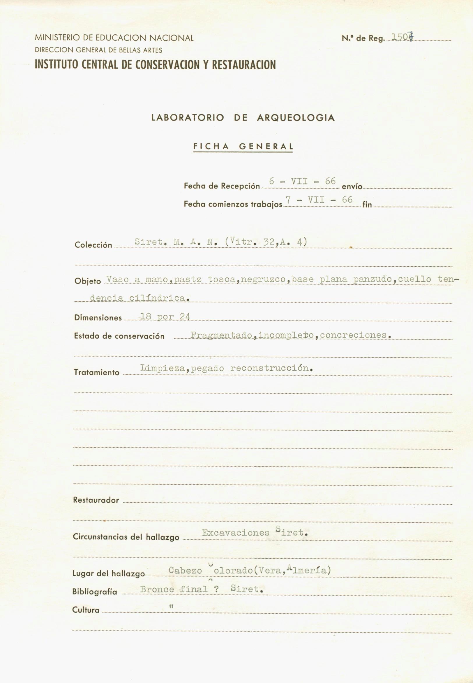 Restauración de vasos de cerámica del Bronce final del yacimiento de Cabezo Colorado en Vera (Almería), procedentes del Museo Arqueológico Nacional (Madrid)