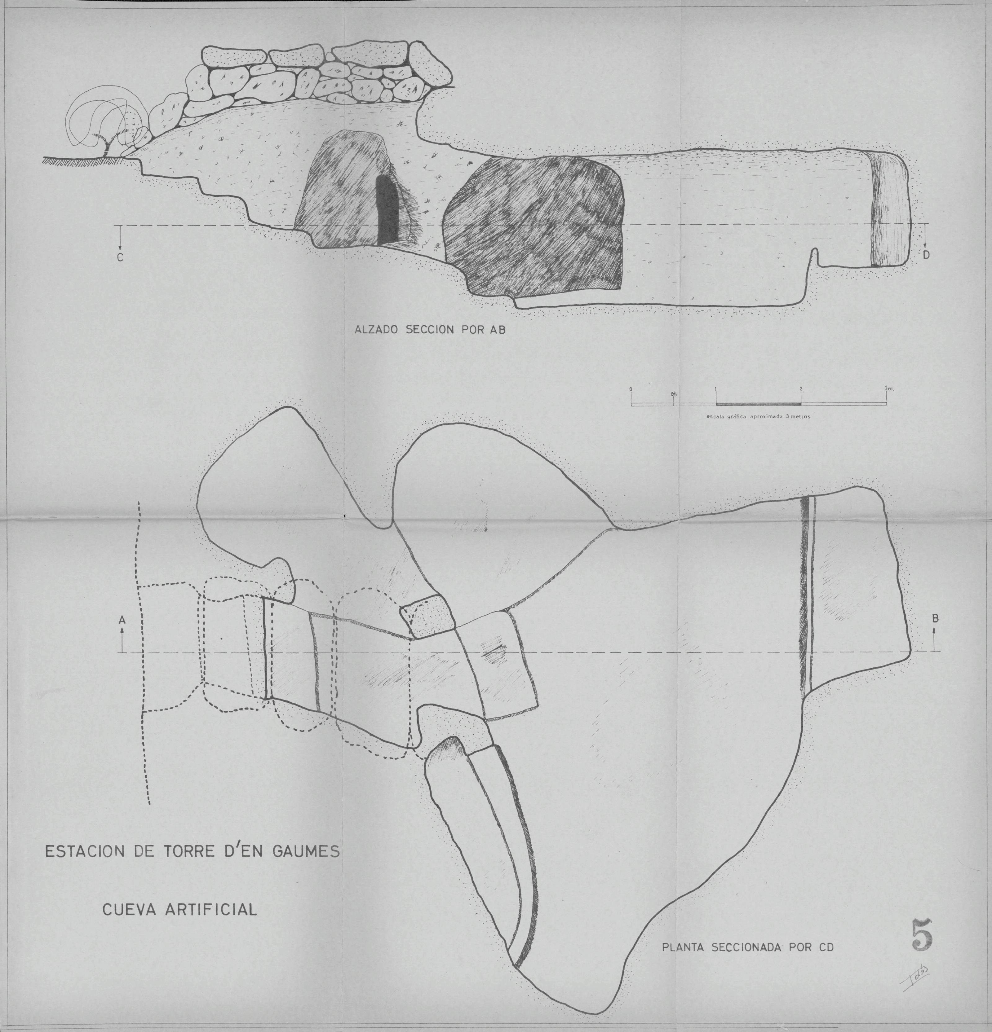 TORRE D'EN GAUMES.: CUEVA ARTIFICIAL. PLANTA SECCIONADA Y ALZADO-SECCION.