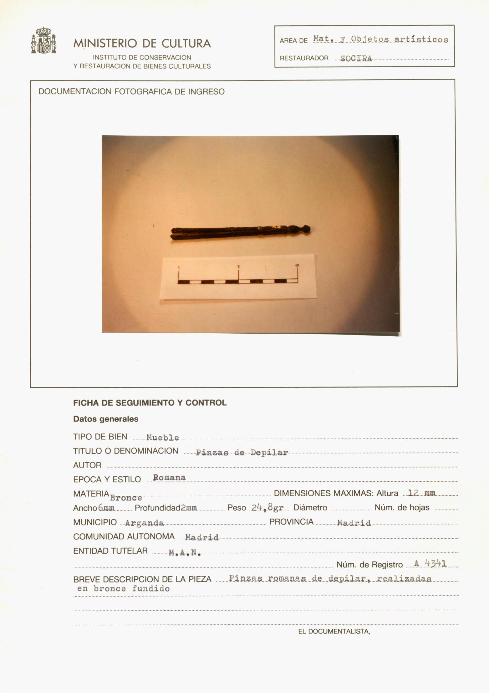 Restauración de unas pinzas de depilar de bronce halladas en Arganda (Madrid), procedentes del Museo Arqueológico Nacional (Madrid)