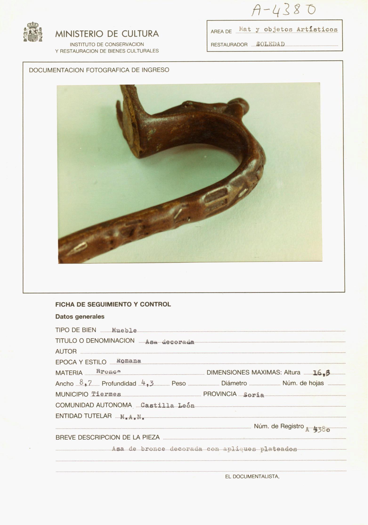 Restauración de un asa romana de bronce con apliques de plata, hallada en Tiermes (Soria), procedente del Museo Arqueológico Nacional (Madrid)