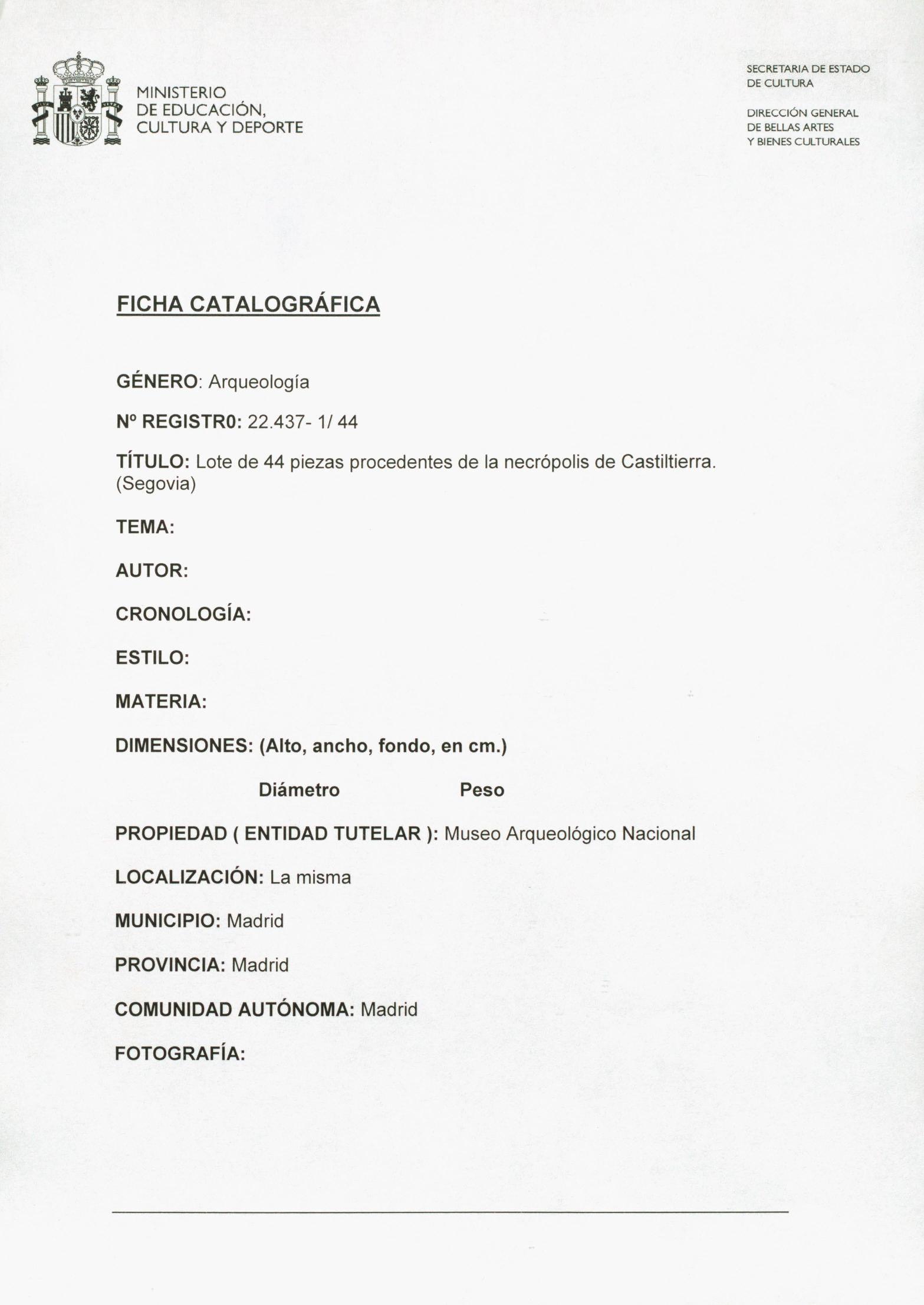 Informes de laboratorio sobre cuarenta y cuatro piezas arqueológicas, halladas en la Necrópolis de Castiltierra (Segovia), procedentes del Museo Arqueológico Nacional (Madrid)