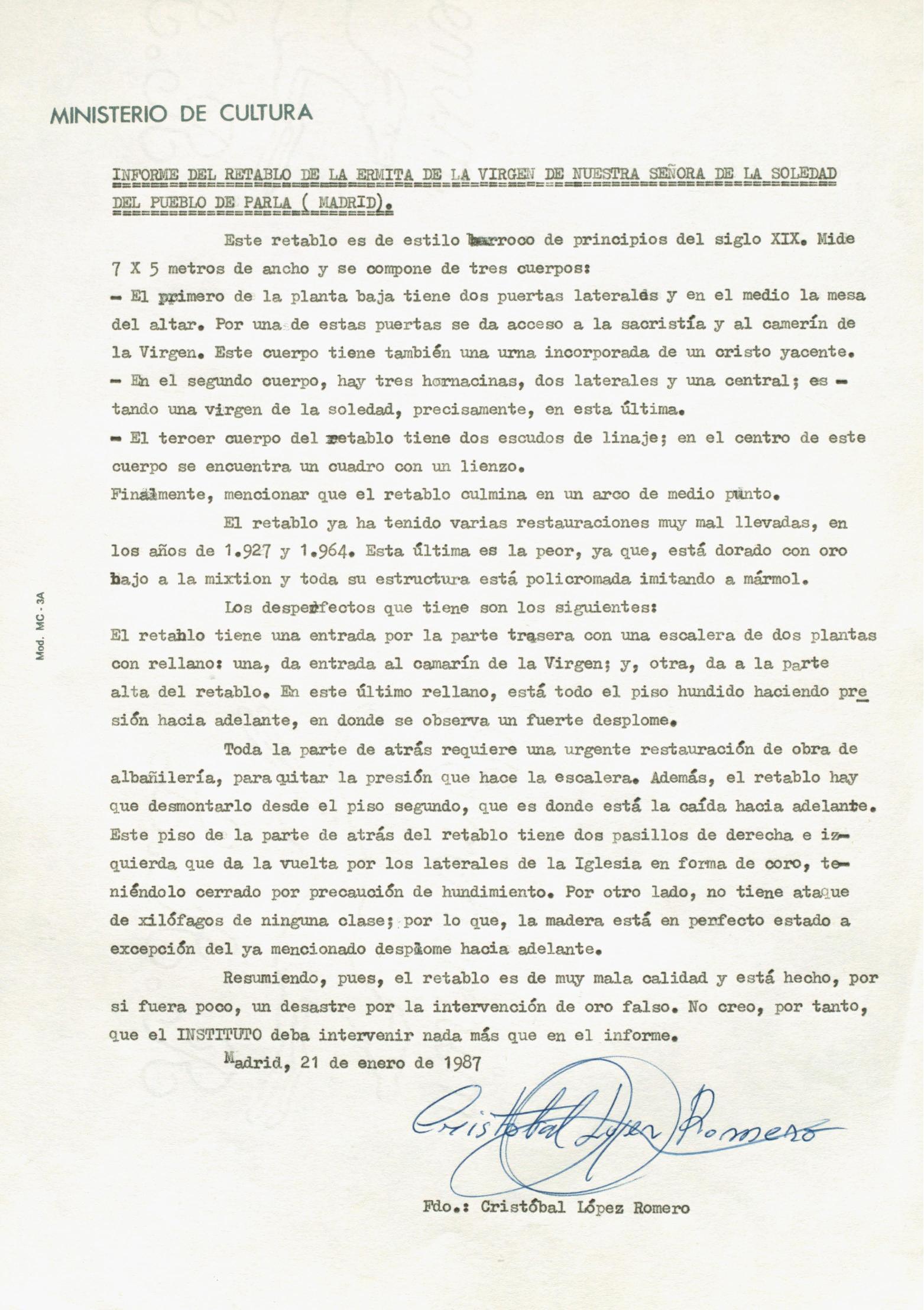 Informe de conservación de un retablo de principios del siglo XIX, procedente de la Ermita de la Virgen de Nuestra Señora de la Soledad en Parla (Madrid)
