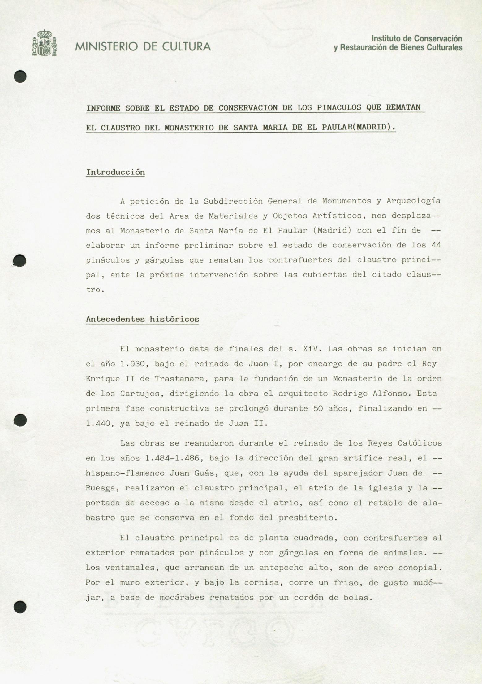 Informe de conservación de los pináculos y gárgolas del claustro y de la Capilla de la Virgen de Montserrat, en el Monasterio de Santa María del Paular en Rascafría (Madrid)