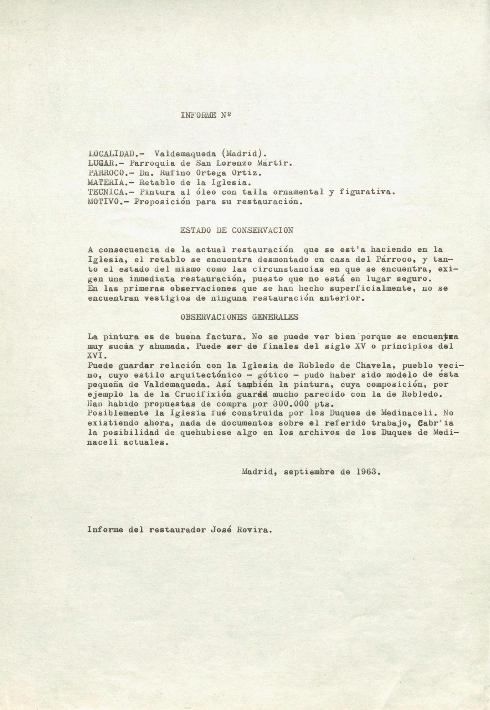 Informes de conservación del retablo de la Iglesia parroquial de San Lorenzo Mártir de Valdemaqueda (Madrid)