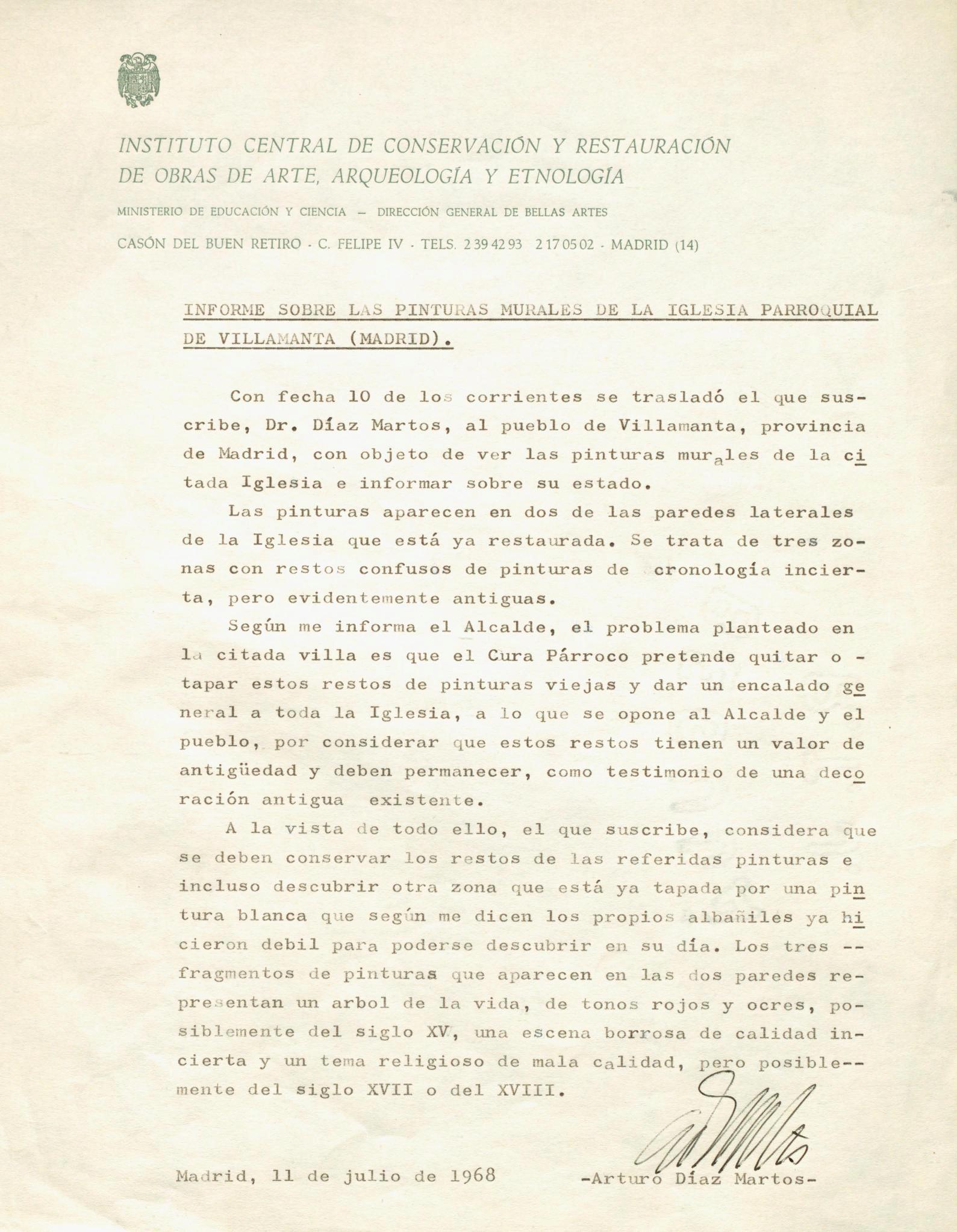 Informe de visita para la conservación de las pinturas murales de la Iglesia parroquial de Villamanta (Madrid)