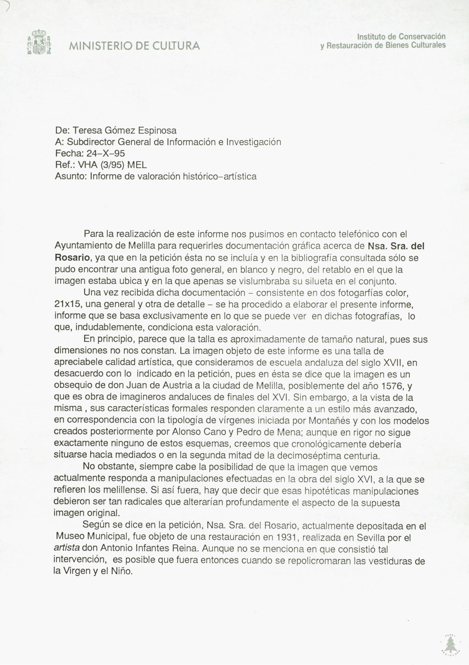 Informe de valoración histórica-artística de la talla de madera de "Nuestra Señora del Rosario", procedente de la Iglesia parroquial de la Purísima Concepción (Melilla)