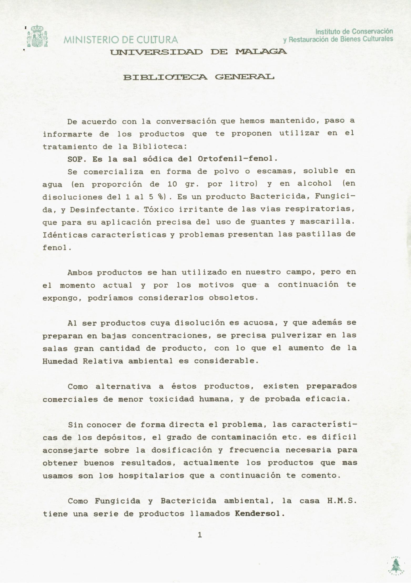 Informe sobre los productos químicos propuestos para el tratamiento de la Biblioteca de la Universidad de Málaga