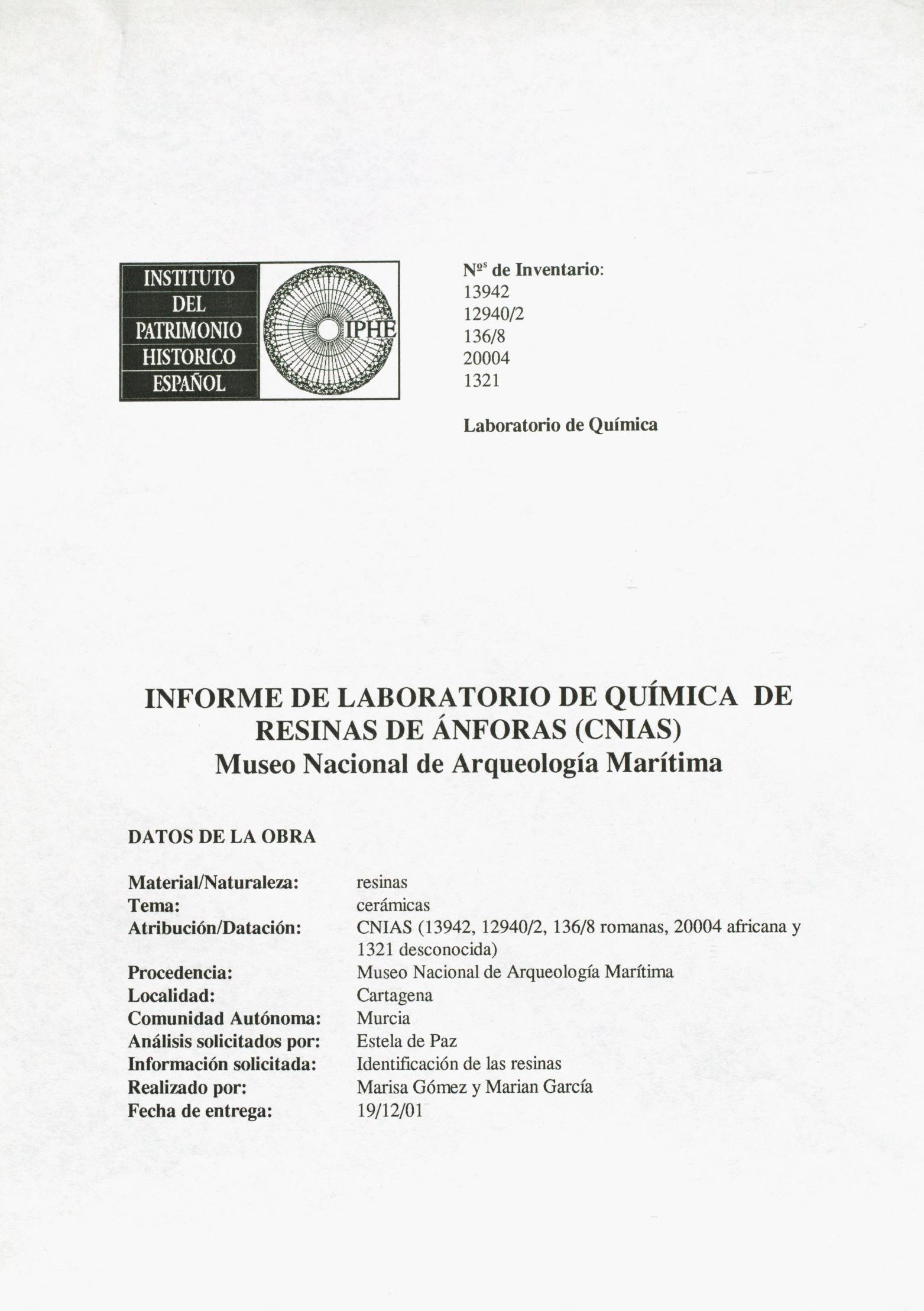 Informe de laboratorio sobre el análisis químico de resinas de ánforas procedentes del Museo Nacional de Arqueología Marítima de Cartagena (Murcia)