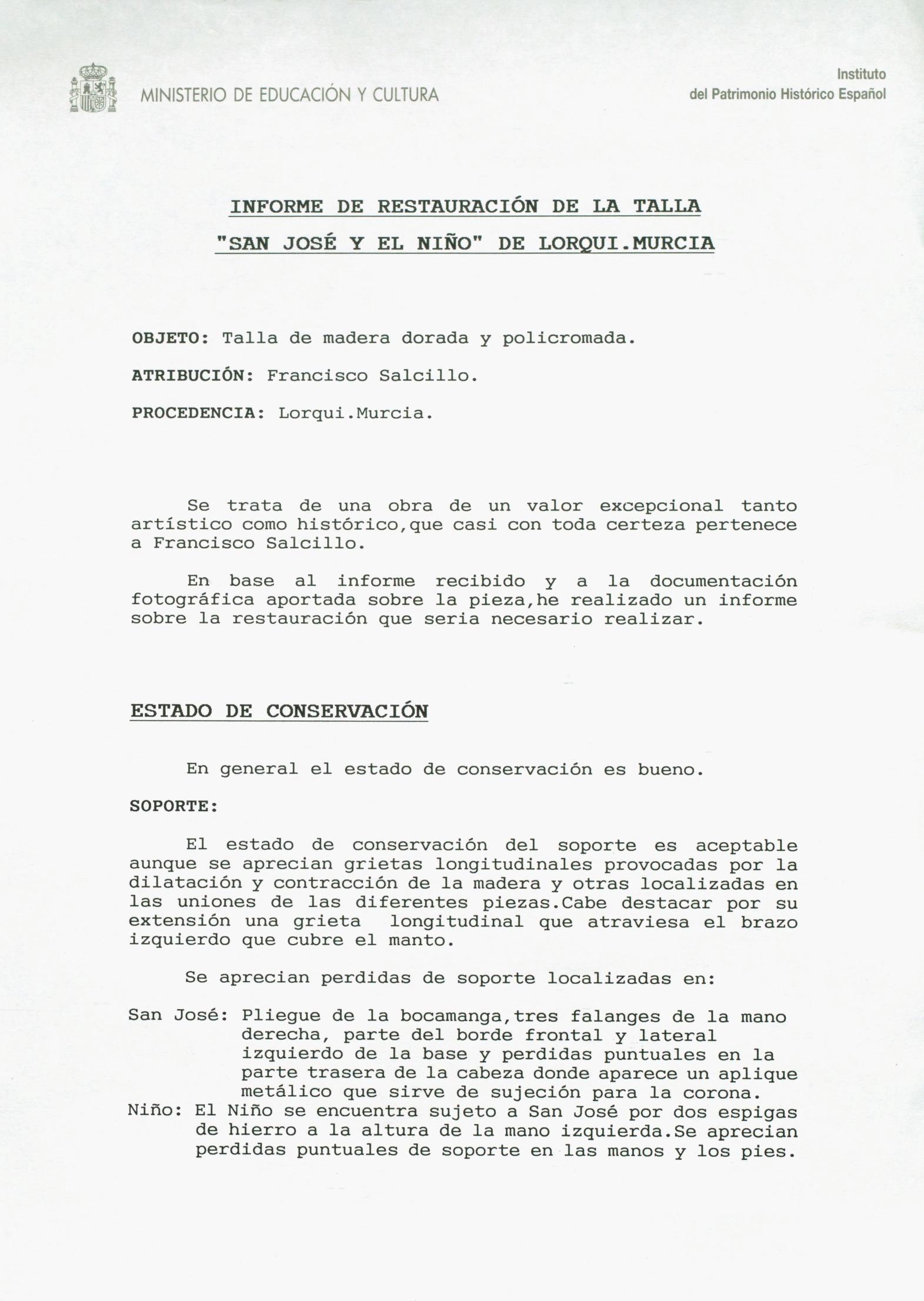 Restauración de una talla en madera dorada de "San José y el Niño", de Francisco Salzillo, procedente de la Iglesia parroquial de Santiago Apóstol de Lorquí (Murcia)