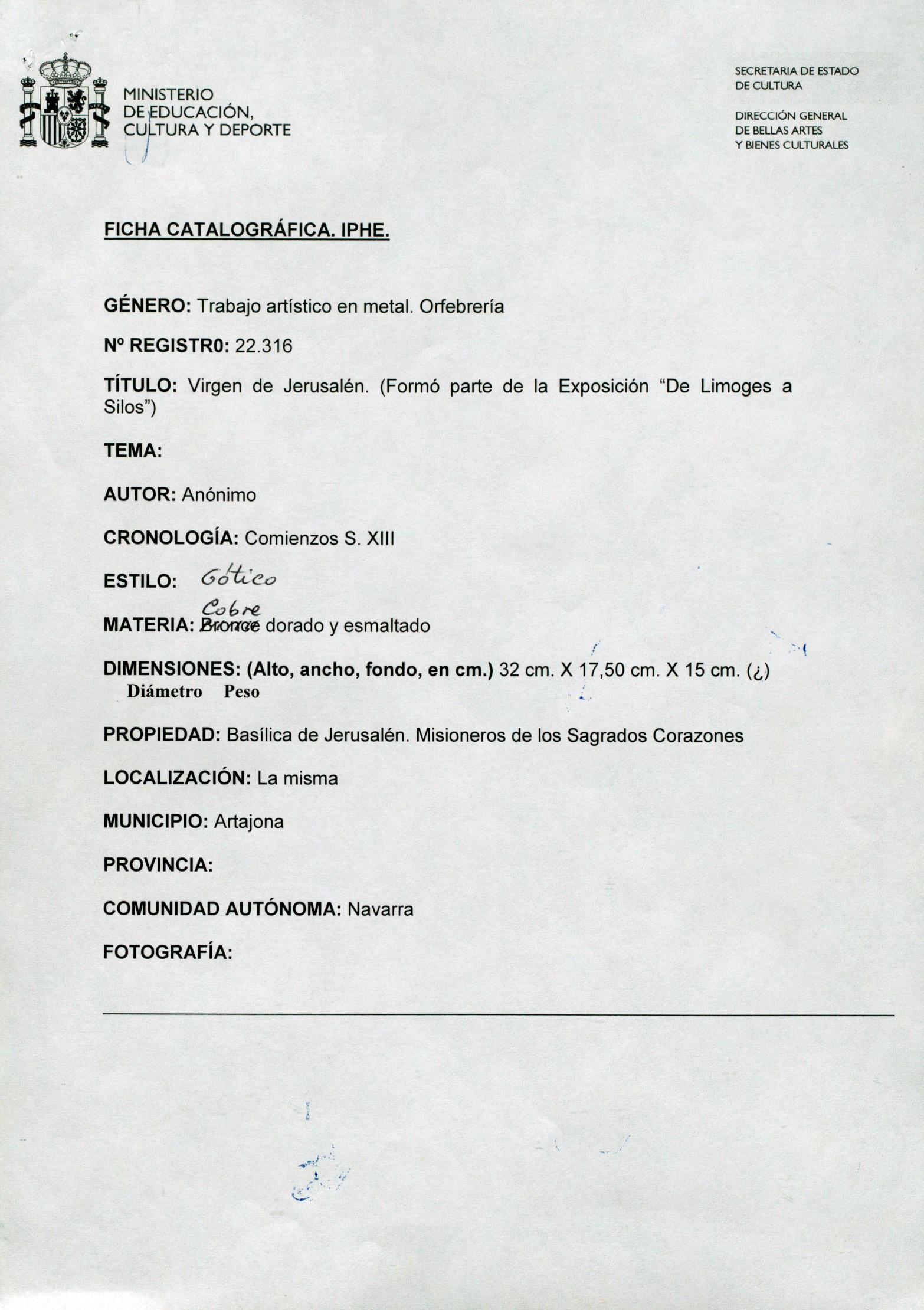 Informe de laboratorio de una imagen en bronce de "Nuestra Señora de Jerusalén", del siglo XIII, procedente de la Basílica de Jerusalén en Artajona (Navarra)
