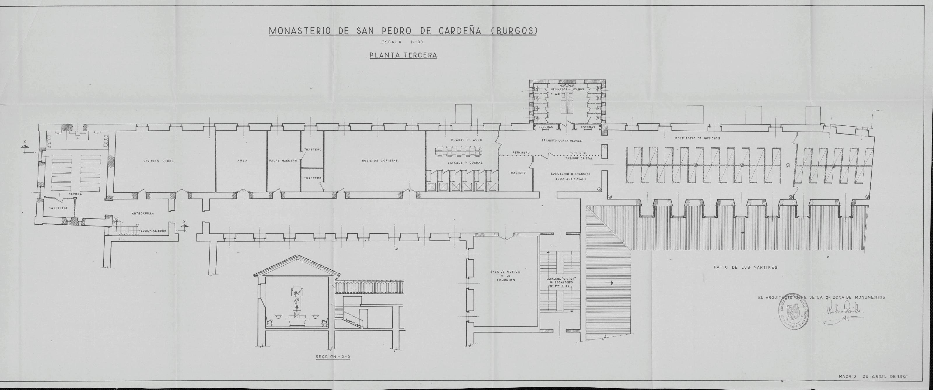 Monasterio de San Pedro de Cerdeña. Castrillo del Val. Burgos.: Planta tercera del monasterio y sección por capilla.