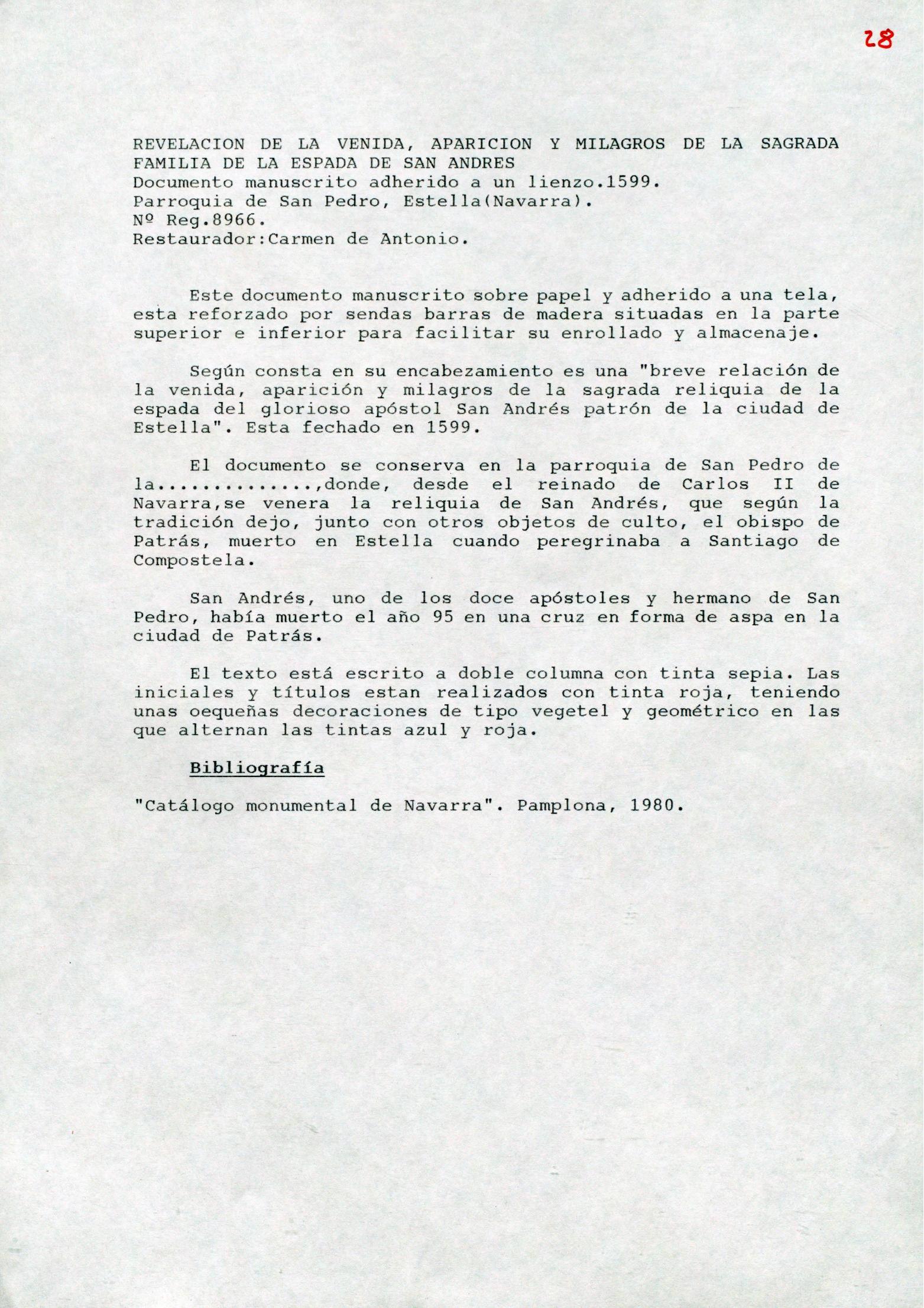 Informe histórico-artístico de un documento manuscrito en papel adherido a un lienzo, procedente de la Iglesia parroquial de San Pedro de la Rúa en Estella (Navarra)