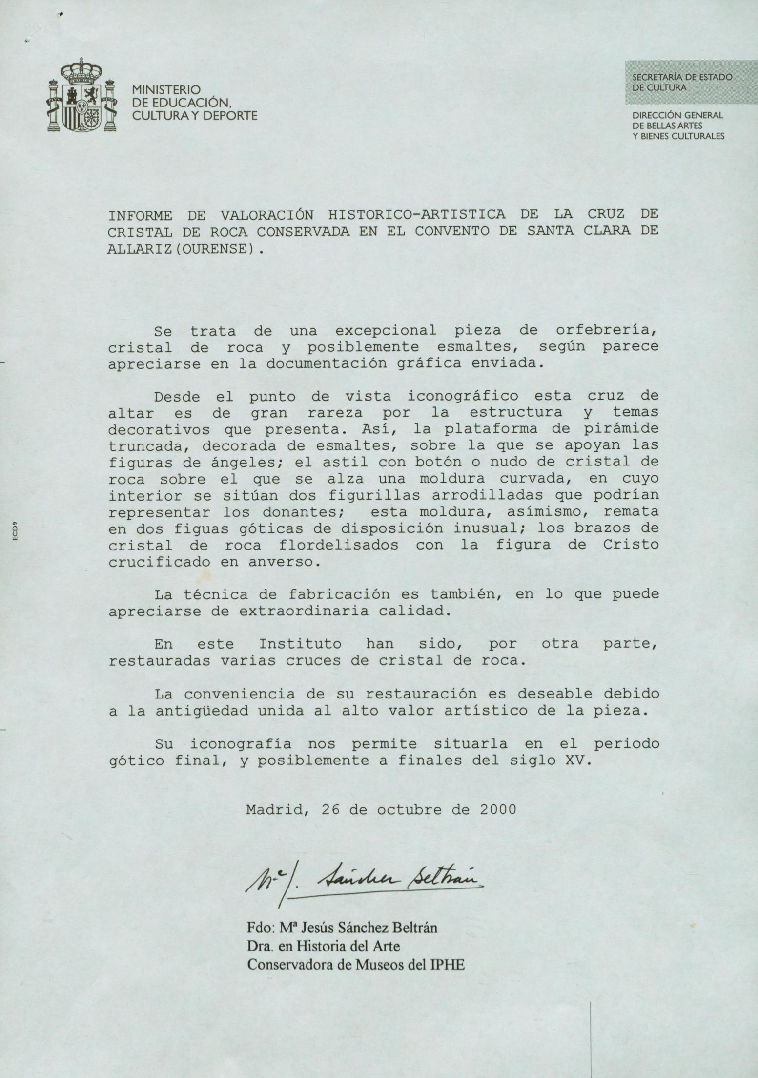 Informe histórico-artístico de una cruz de cristal de roca, del siglo XV, procedente del Convento de Santa Clara en Allariz (Orense)