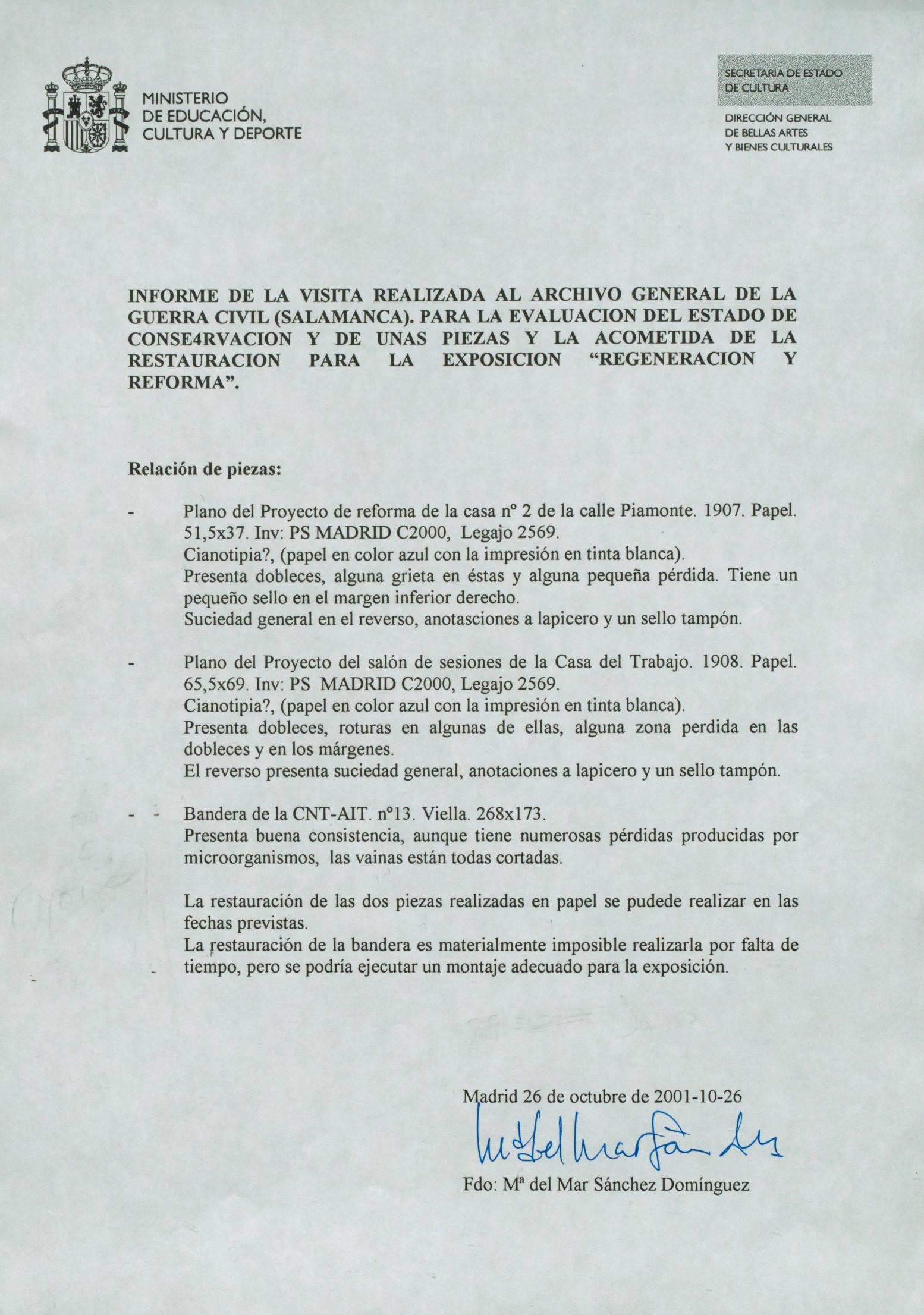 Informe de visita para la conservación de dos planos y una bandera procedentes del Archivo General de la Guerra Civil de Salamanca